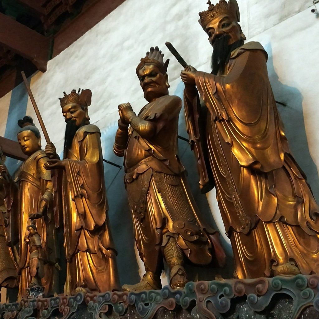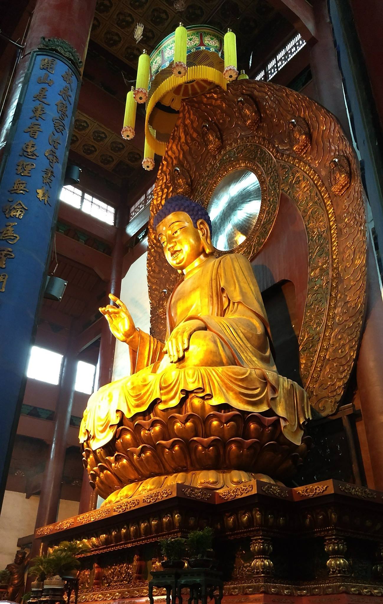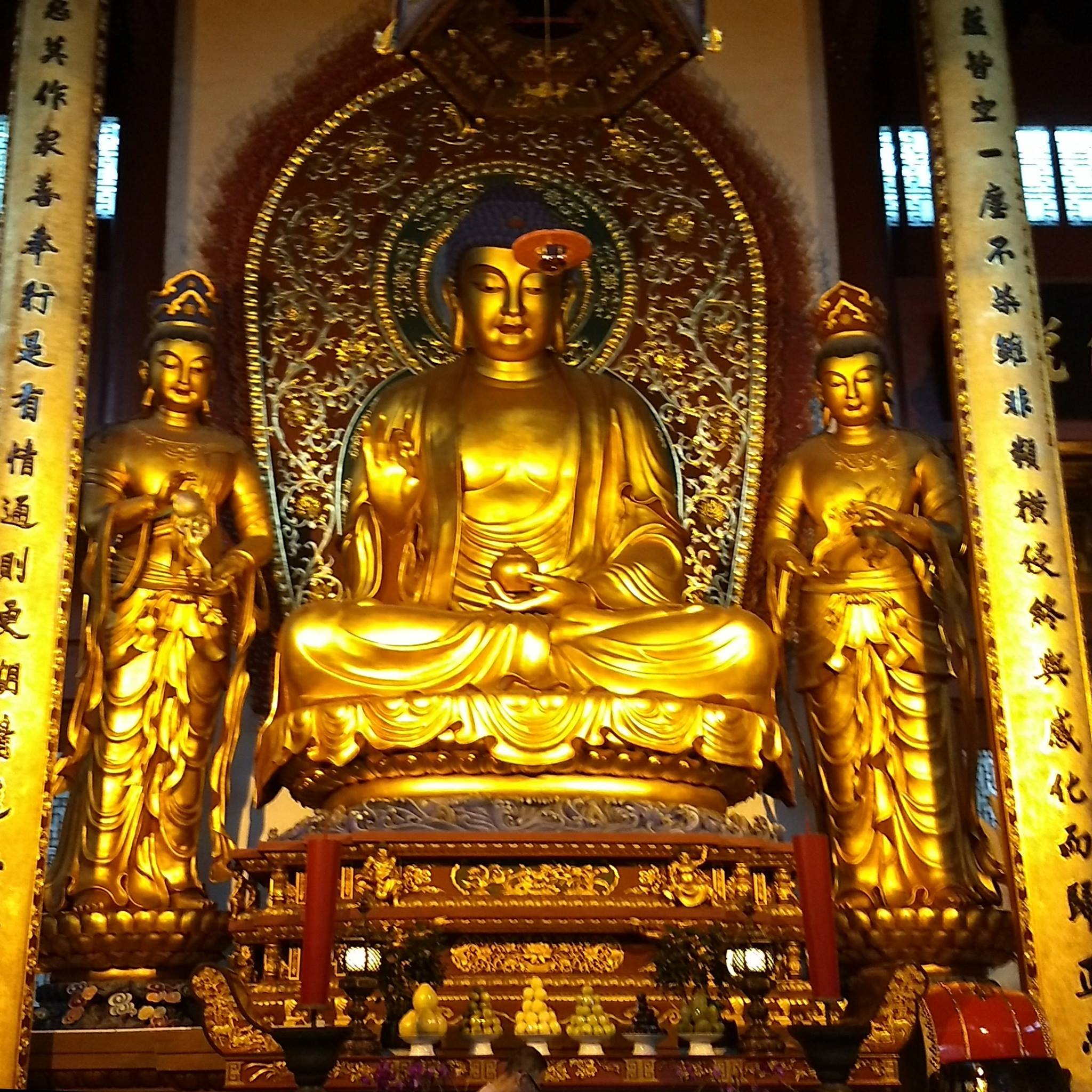 De piek is 209m hoog, maar we hebben hem niet gezien, want hij zat in de wolken. Het kabellift-tochtje dat we voorzien hadden, hebben we dus maar gelaten. Maar we bezochten wel de Ling-Yintempel, het bekendste tempelcomplex van Hangzhou. De boeddhistische tempel werd in 326 n.Chr. gesticht door de ook al uit India afkomstige monnik Wei Li. De tempel bevat drie grote hallen: de Hal van de Vier Hemelse Wachters, de Hal van de Groet Boeddha en de Hal van de Medicijn-Bhoeddha.