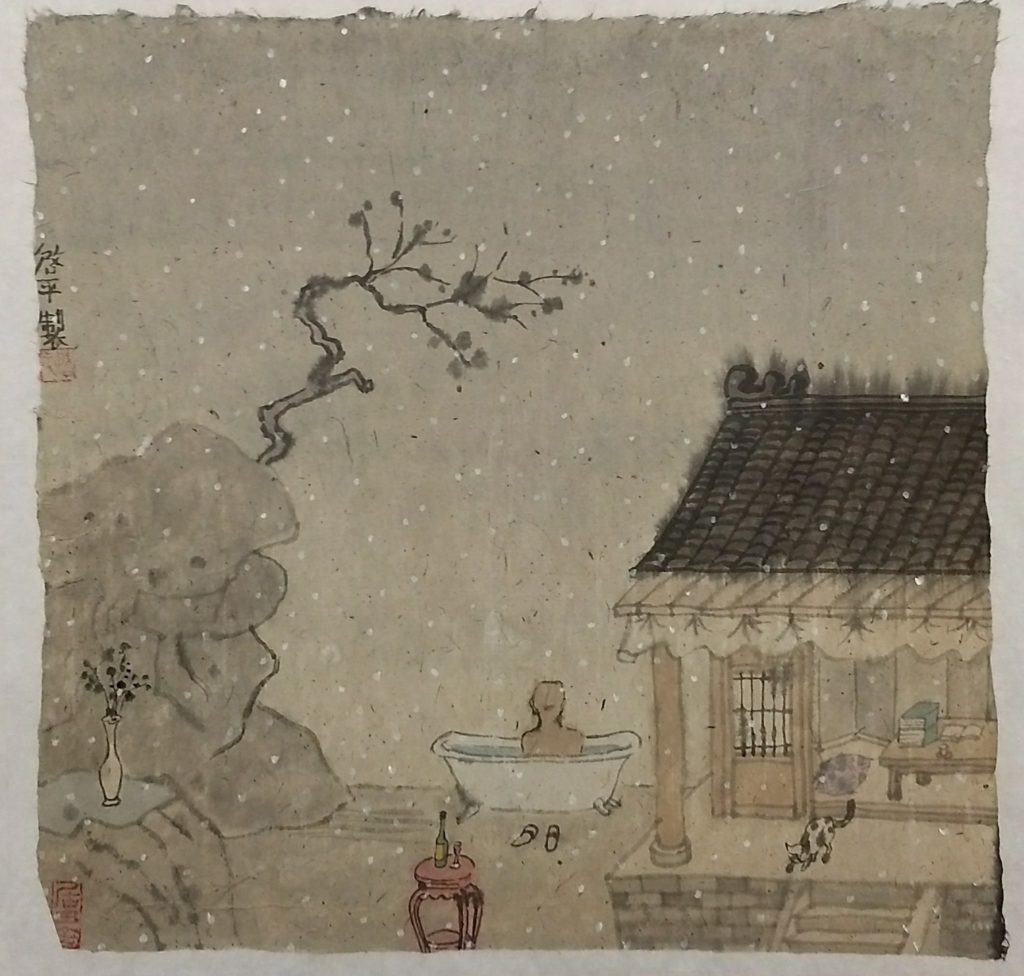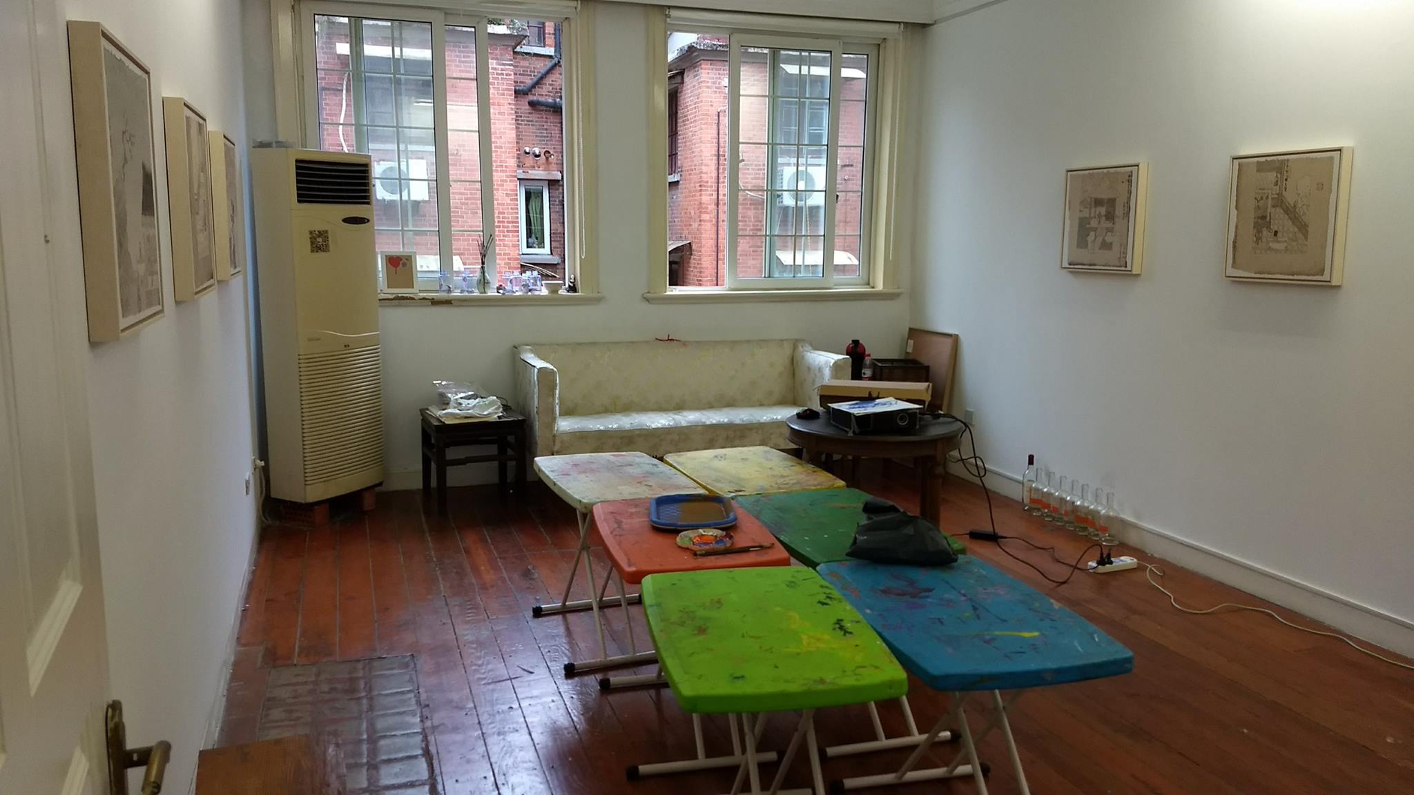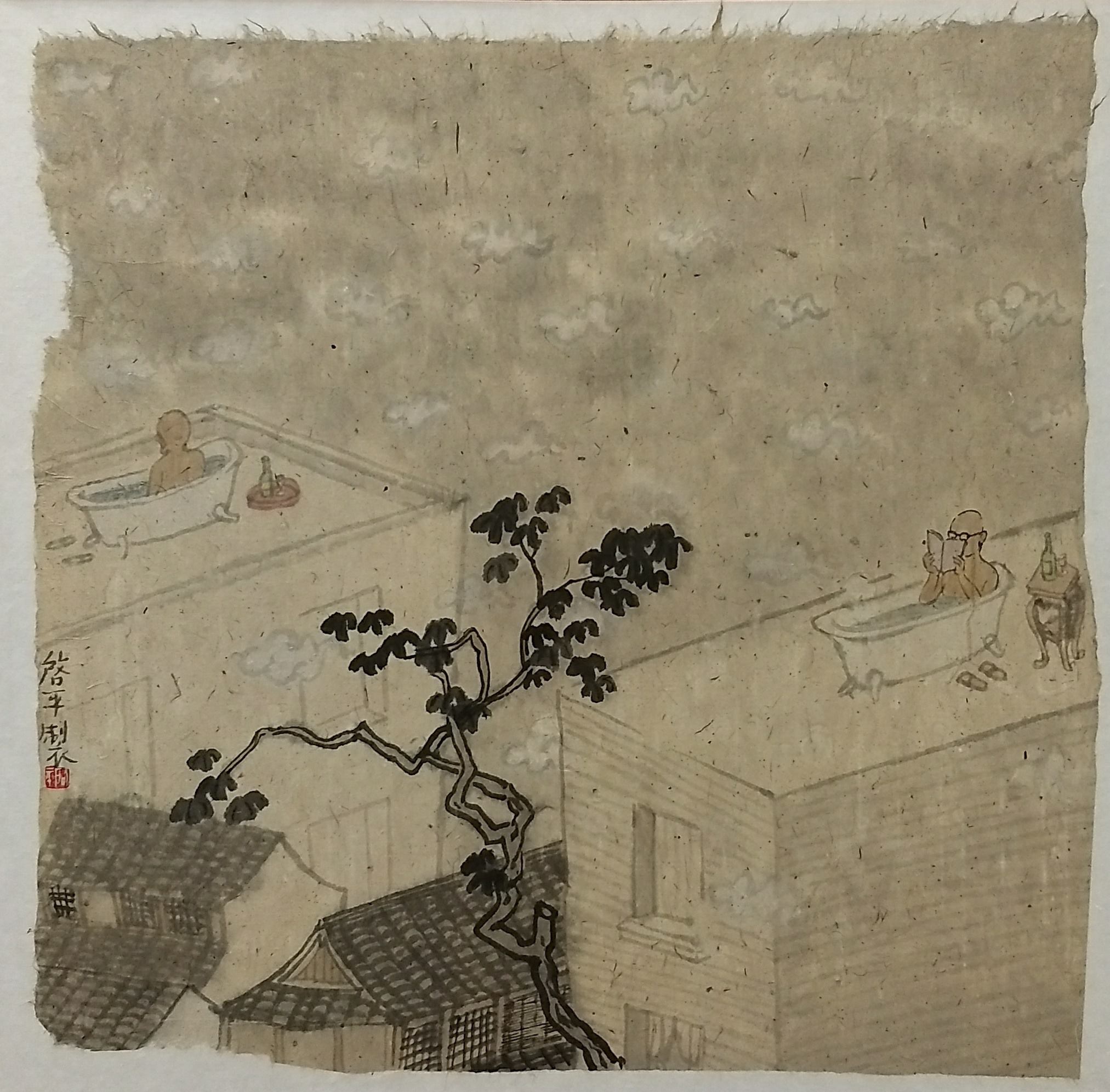 Onderweg zochten we ook een tijd lang naar een galerie. We hadden het adres, zowel in het Engels als in Chinees, maar we moesten het toch alweer een aantal keer vragen vooraleer we door de uitbaatster van een boetiek in de buurt naar een “modelwijk” werden gebracht, waar in één van de huisjes de FQ Projects Gallery gevestigd was. De deur was dicht en we hadden niet meteen verwacht dat er iemand zou opendoen toen we aanbelden, maar dat gebeurde uiteindelijk toch. We mochten binnen in een huisje dat tot galerie was omgevormd, al moesten de kunstwerken de ruimtes delen met allerlei andere voorwerpen 🙂