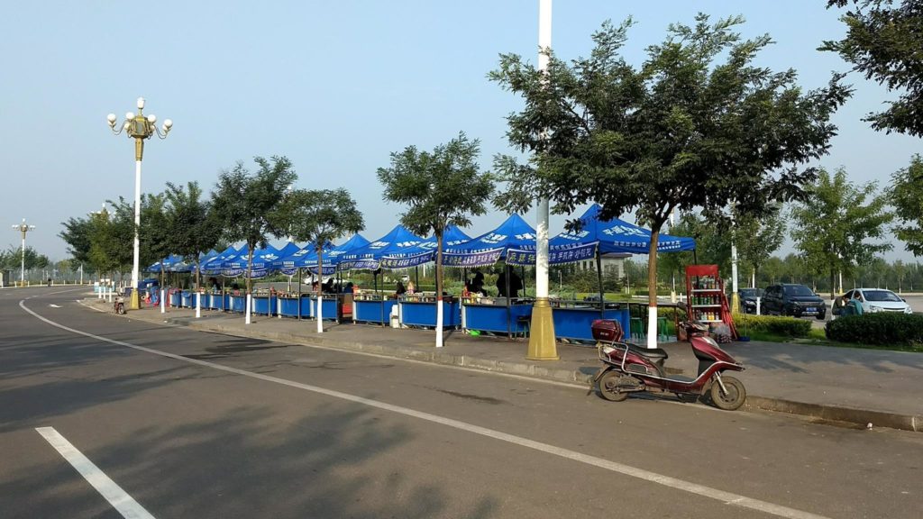 Na het bezoek aan het Wang familiehuis wilden we eigenlijk ook nog naar een tempel in de buurt, maar hoe er te geraken bleek alweer een onoplosbaar probleem. Uiteindelijk besloten we dan maar de tempel te laten vallen. Maar ook terugkeren naar het treinstation met de bus bleek niet evident. We hadden intussen begrepen dat het bus 7 moest zijn, en we vonden zelfs een bushalte, maar daar stonden alle haltes op en het was niet duidelijk in welke richting de bus ging (en dus aan welke kant van de weg we moesten staan). Ook na het proberen te vragen aan een aantal Chinezen en zelfs de politie, was het ons nog steeds niet duidelijk. Tot 1 van de politieagenten via zijn smartphone en Baidu Translate duidelijk maakte dat de bus niet meer kwam. Waarom precies weten we nog steeds niet, ik denk doordat de weg verderop geblokkeerd was, maar zeker ben ik daar niet van. We zijn dan maar beginnen wandelen naar het station, maar dat ligt 6 km van de stad, dus waren we blij we na een tijdje toch een taxi zagen. We waren dan anderhalf uur te vroeg – dat verhaal heb ik in het begin van dit verslag verteld.