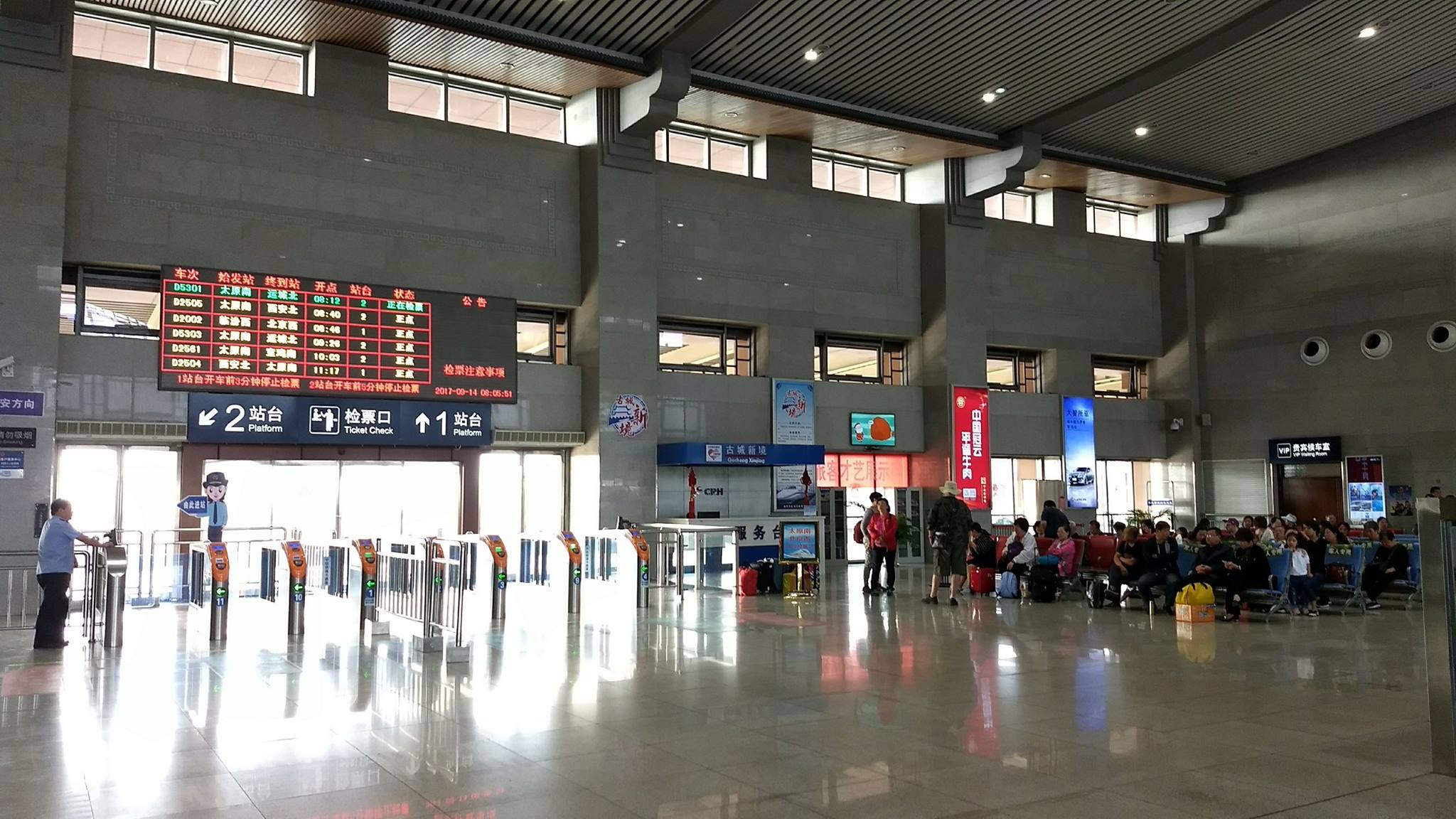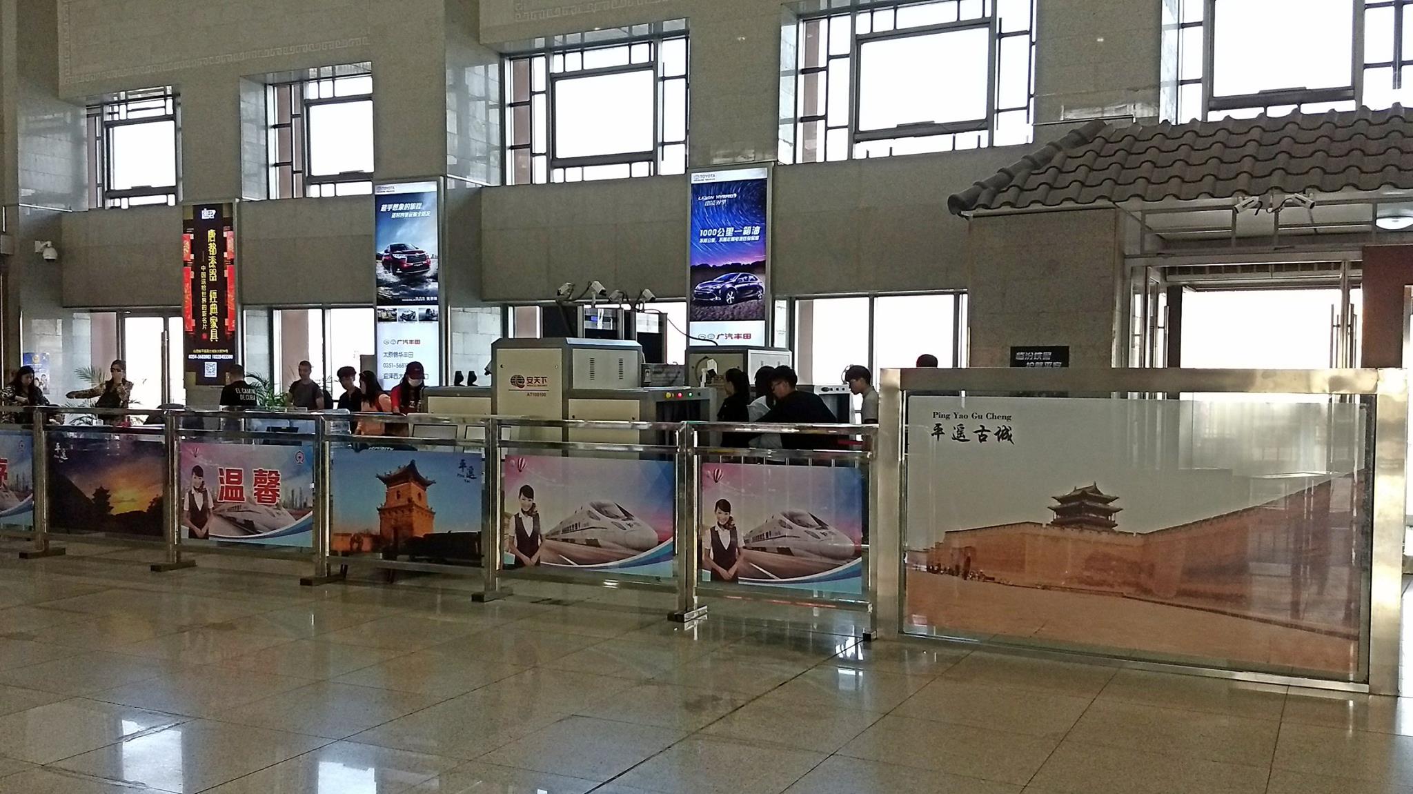 Maat laat ik beginnen bij het begin: het alarm stond op 6u30, want we hadden treintickets naar Lingshi om 8u40, en je moet ruim op voorhand in het station zijn, dus een taxi zou ons om 7u30 oppikken. Eigenlijk wilden we met de bus naar het station, maar dat bleek een zo goed als onmogelijke opgave. In het station waren er de gebruikelijke controles en 20 minuten vóór de trein zou toekomen, werd er in megafoons geschreeuwd: blijkbaar moesten we allemaal netjes op een rij gaan klaarstaan om door de ticketgate te gaan. In groep ging het dan naar het perron, waar opnieuw personeelsleden klaarstaan met megafoons om iedereen toe te schreeuwen achter de witte lijn te blijven en op de juiste plaats (voor de juiste wagon) te gaan staan. Het lijkt wel een grote kleutertuin.