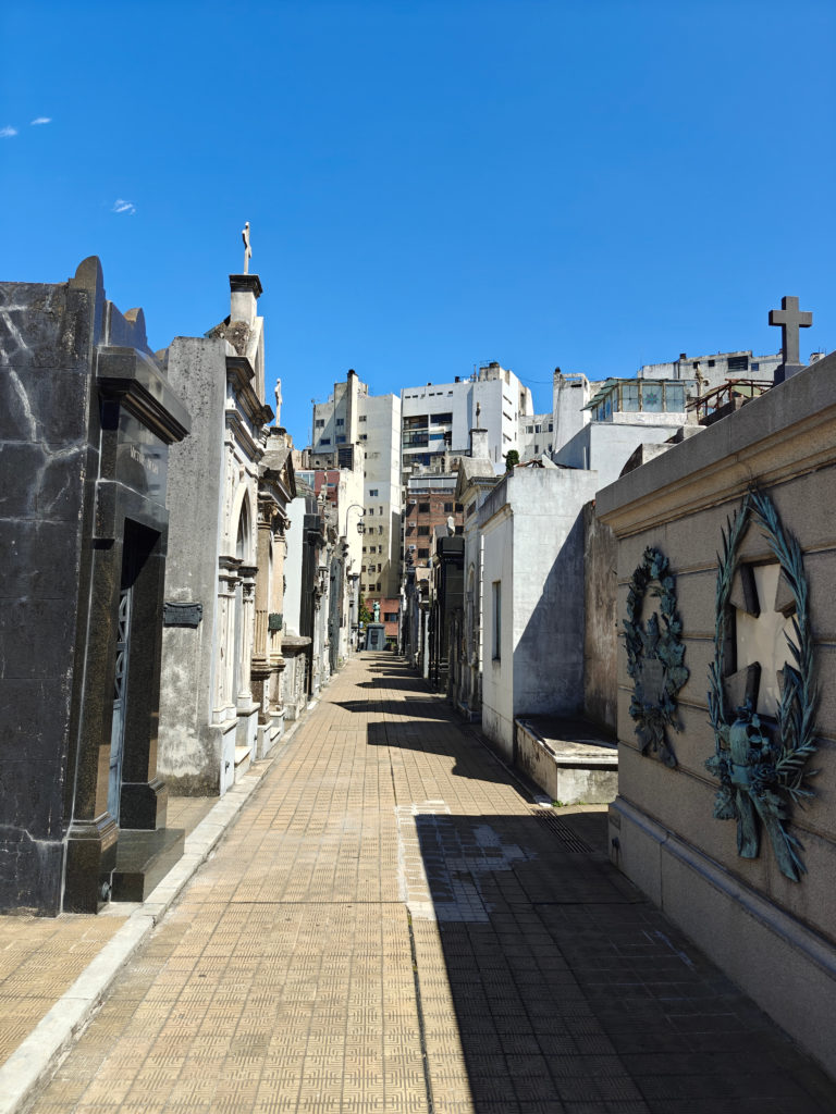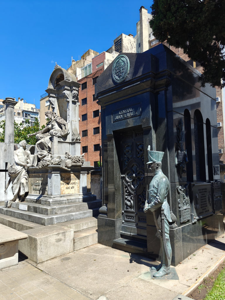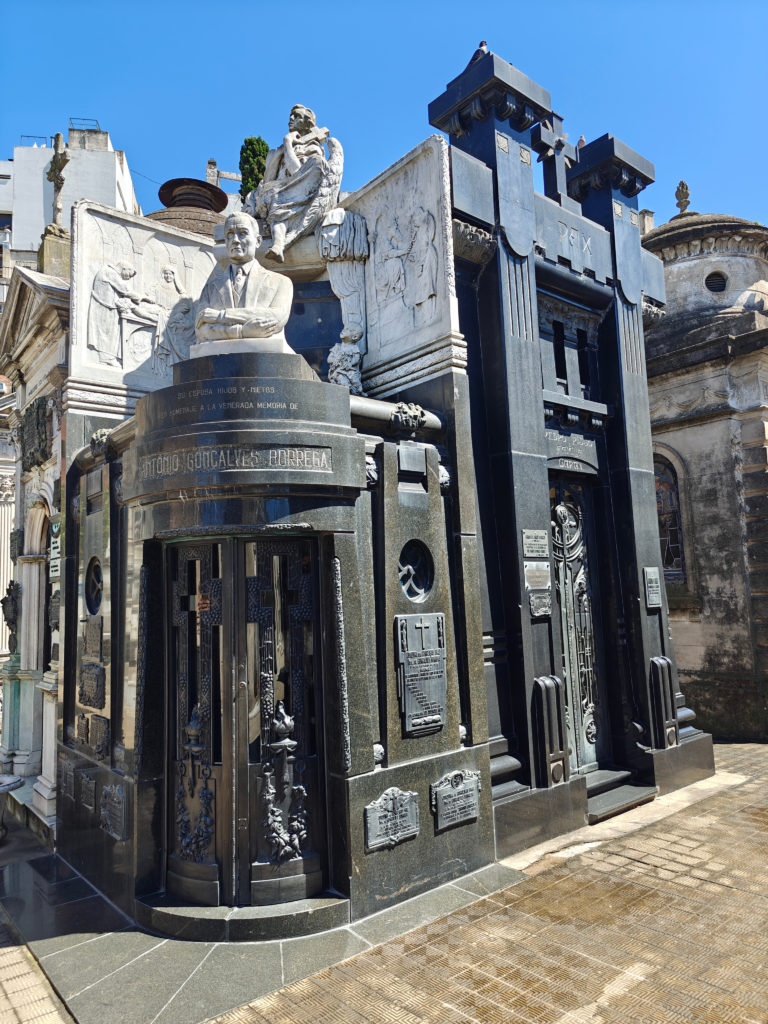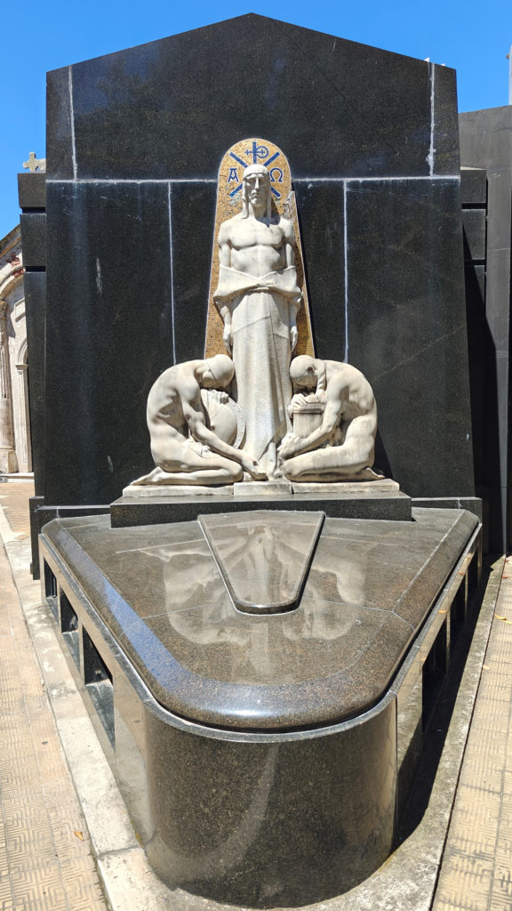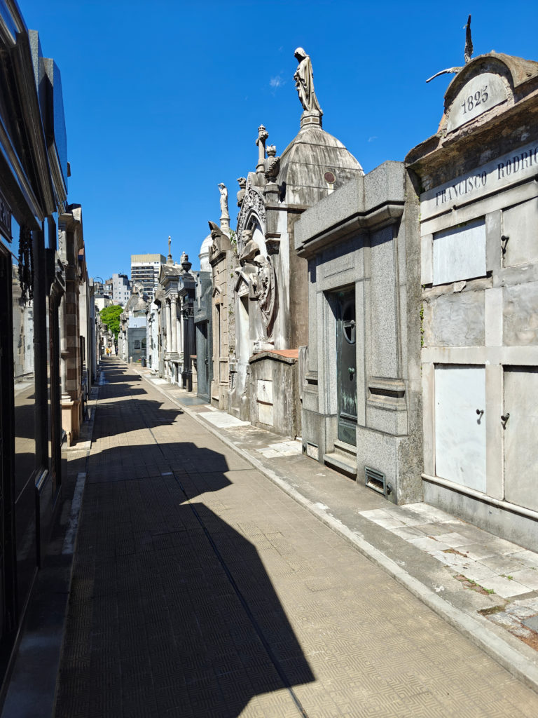 Daarna bezochten we het Cementerio de la Recoleta. De toegangsprijs is best pittig voor een kerkhof (16.000 pesos, zo’n 15 euro) maar het is dan ook de moeite waard. De wijk en de begraafplaats danken hun naam aan de recoletos, de paters recollecten of minderbroeders die hier na de onafhankelijkheid gingen wonen, in de nabijgelegen Basilica Nuestra Senora del Pilar, een 18e-eeuwse kerk. Wie zich een plaats heeft verworven op het Cementerio moet bij leven rijk zijn geweest en, wat zeker zo belangrijk is, tot de hogere klasse hebben behoord. Ook Eva Duarte, beter bekend als ‘Evita’, ligt hier begraven, en al komen de meeste toeristen voor haar graf, het is niets bijzonders, en ik heb er dan ook geen foto van genomen, in tegenstelling tot vele andere graven.