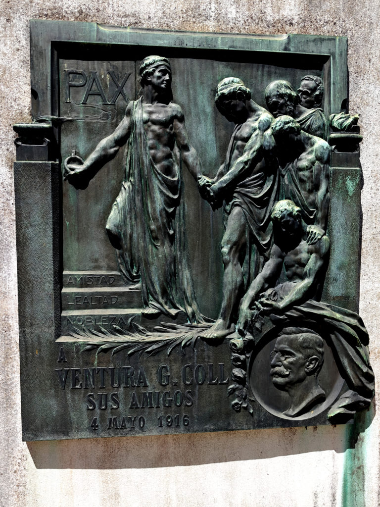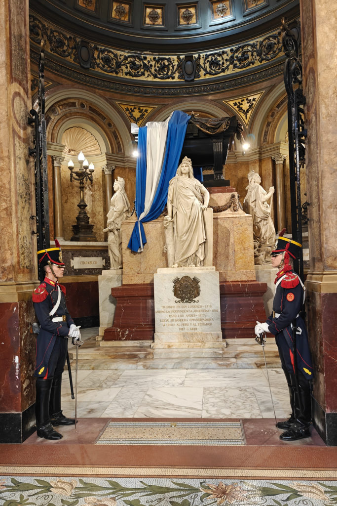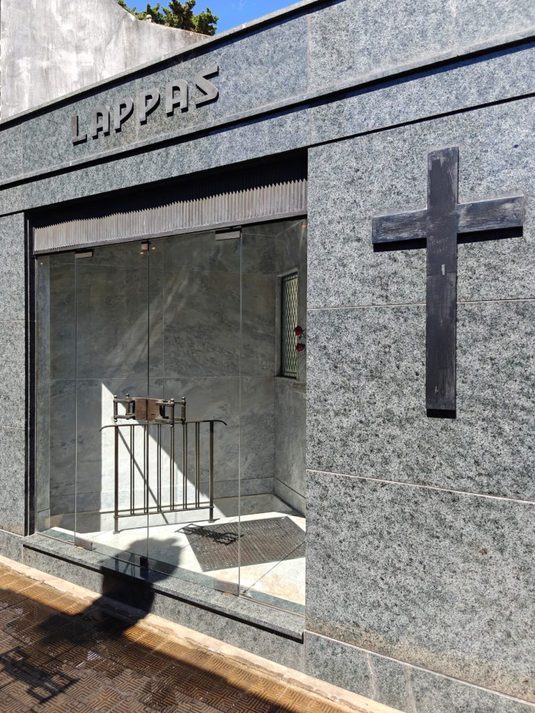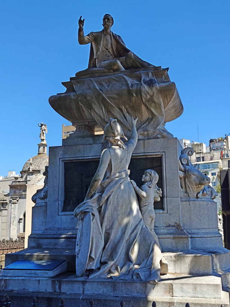 Daarna bezochten we het Cementerio de la Recoleta. De toegangsprijs is best pittig voor een kerkhof (16.000 pesos, zo’n 15 euro) maar het is dan ook de moeite waard. De wijk en de begraafplaats danken hun naam aan de recoletos, de paters recollecten of minderbroeders die hier na de onafhankelijkheid gingen wonen, in de nabijgelegen Basilica Nuestra Senora del Pilar, een 18e-eeuwse kerk. Wie zich een plaats heeft verworven op het Cementerio moet bij leven rijk zijn geweest en, wat zeker zo belangrijk is, tot de hogere klasse hebben behoord. Ook Eva Duarte, beter bekend als ‘Evita’, ligt hier begraven, en al komen de meeste toeristen voor haar graf, het is niets bijzonders, en ik heb er dan ook geen foto van genomen, in tegenstelling tot vele andere graven.