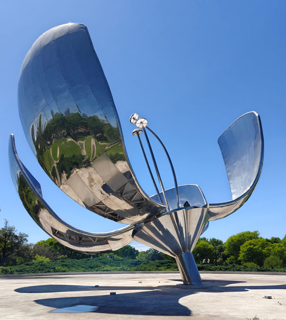 Voor we de metro namen naar Plaza Mayor, liepen we nog even langs de Floralis Genérica. Dat is een sculptuur van staal en aluminium, een geschenk aan de stad van de Argentijnse architect Eduardo Catalano. Die zei ooit dat de bloem een synthese is van alle bloemen en tegelijkertijd een symbool van hoop dat elke dag herboren wordt als hij opengaat. Het werd in 2002 gemaakt en was ontworpen om zijn bloemblaadjes ’s nachts te sluiten en ze ’s ochtends te openen. Dat doet het al lang niet meer en intussen ontbreken ook een aantal bladeren. Die zijn ‘en reparación’ en het is onduidelijk hoe lang dat zal duren.