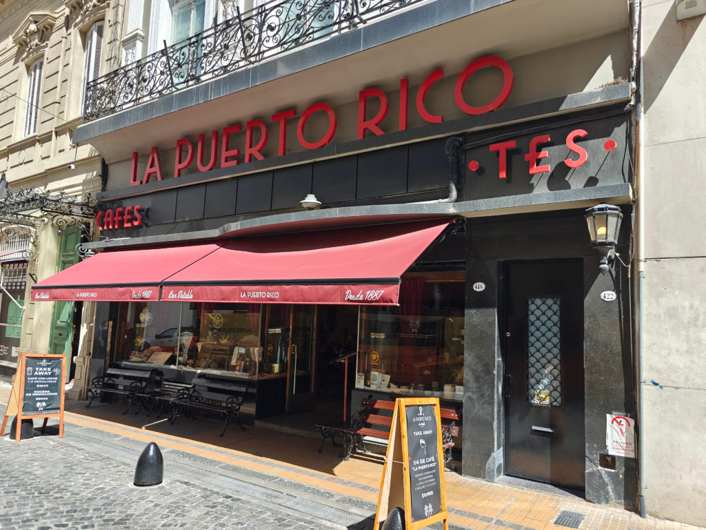 Dit café werd in 1887 opgericht door Gumersindo Cabedo, een Spanjaard die een bijzondere smaak voor koffie had ontwikkeld nadat hij een aantal jaren in Puerto Rico had gewoond. In de loop der jaren hebben belangrijke figuren uit de Argentijnse cultuur en geschiedenis hier aan tafel gezeten en genoten van de gebrande koffie, zoals de schrijvers Jorge Luis Borges, Victoria Ocampo en Adolfo Bioy Casares, de dichter en componist Enrique Cadícamo, de actrice Niní Marshall, en zelfs de toenmalige aartsbisschop van Buenos Aires, Jorge Bergoglio, later bekend als paus Franciscus. We werden bediend door een heel vriendelijke ober die mij complimenteerde met mijn Spaans. Hijzelf bleek uit Brazilië te komen, was intussen al decennia in Argentinië, waarvan de laatste 10 jaar als ober in La Puerto Rico. We kozen voor het dagmenu: een lekkere ensalada met een glas witte wijn, voor 11.800 pesos.