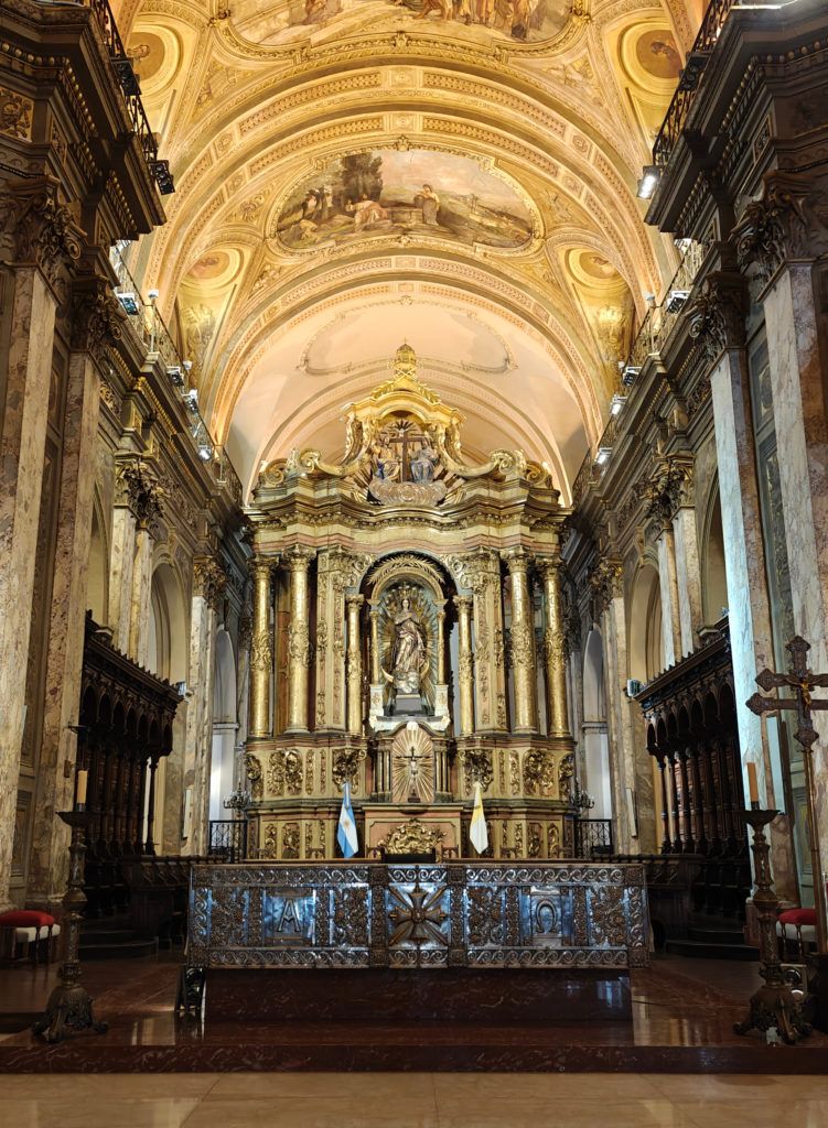 Aan de andere kant van het plein staat de in 1791 ingewijde Catedral Metropolitana. Die ziet er vanbuiten meer uit als een antieke tempel dan als een katholieke kerk. Pas als je binnen staat, merk je het kruisvormige grondplan en de koepel op. In het rechterschip bevindt zich een mausoleum met de overblijfselen van de Argentijnse bevrijder generaal José San Martín, met twee lijfwachten die het moeten bewaken.