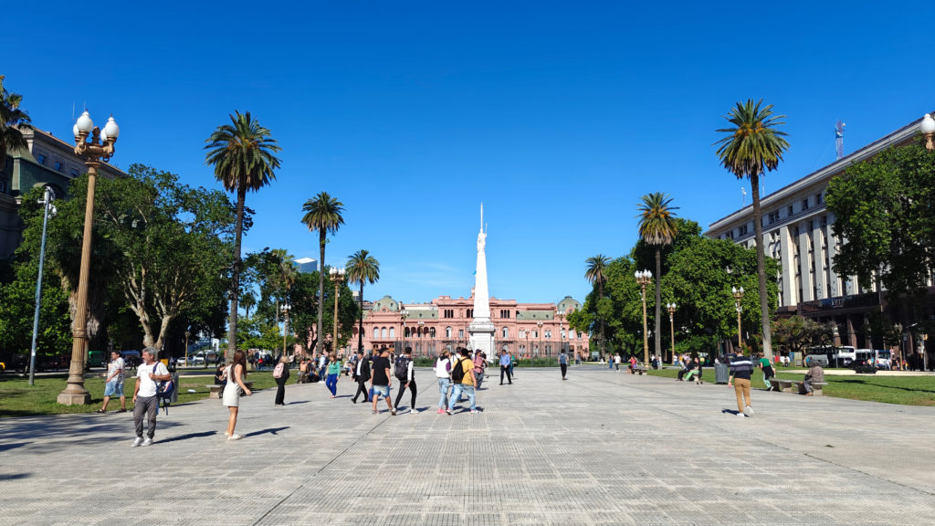 Aan de rand van het plein staat het Casa Rosado. De opvallende roze kleur, die het gebouw tijdens zonsondergang fel laat oplichten, kreeg het in 1873 ten tijde van de regeerperiode van Domingo Faustino Sarmiento. Op het balkon van Casa Rosada hield Evita Perón de toespraken die honderdduizenden Argentijnen tot tranen toe roerden. Haar man, president Juan Perón (1895-1974) werd geboren in de provincie Buenos Aires en ging op 15-jarige leeftijd naar de militaire school. Hier bleek hij uiterst talentvol en snel klom hij op in de militaire hiërarchie. In de jaren dertig was hij militair waarnemer in het fascistische Italië. In juni 1943 was hij als kolonel een belangrijke figuur in de militaire coup tegen het burgerbewind van Ramón Castillo. Dit werd nodig geacht, omdat de zittende president ernstig ziek was en weigerde de macht over te dragen aan zijn vicepresident, waardoor het land verviel in chaos. Peron was minister in de nieuwe regering. Hij werd echter op 9 oktober 1945 tot ontslag gedwongen door tegenstanders binnen de regering en kort daarna gearresteerd, maar massabetogingen dwongen zijn vrijlating af. Perón was zo populair dat hij kort daarna verkozen werd tot president van Argentinië op 24 februari 1946. Perón ontvouwde zijn politiek van sociale en economische hervormingen en claimde een derde weg te bewandelen, tussen kapitalisme en communisme. Hiertoe volgde hij een solidaristische en corporatistische lijn, die klassenverzoening en nationale eenheid tot doel had. Hij was stevig gekant tegen de Amerikanen en de Britten en voerde een nationalisatie van de industrie door, alsook een sterke industrialisatie van het land. Het peronisme is nog steeds een belangrijke factor in de Argentijnse politiek.