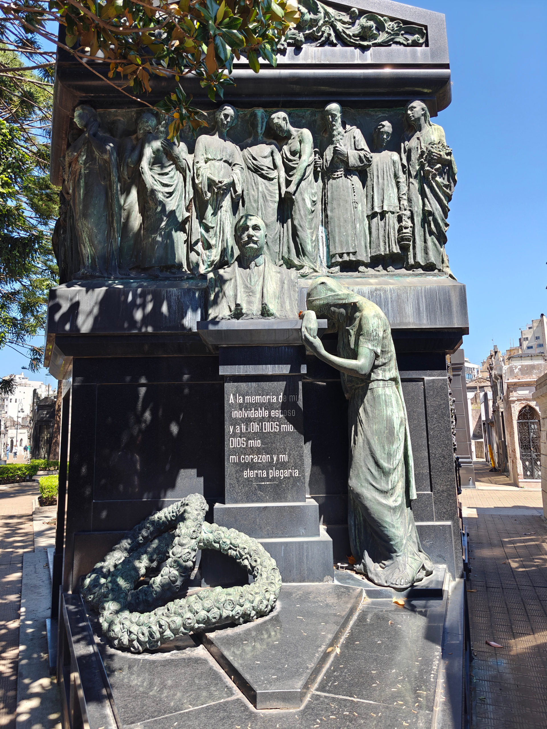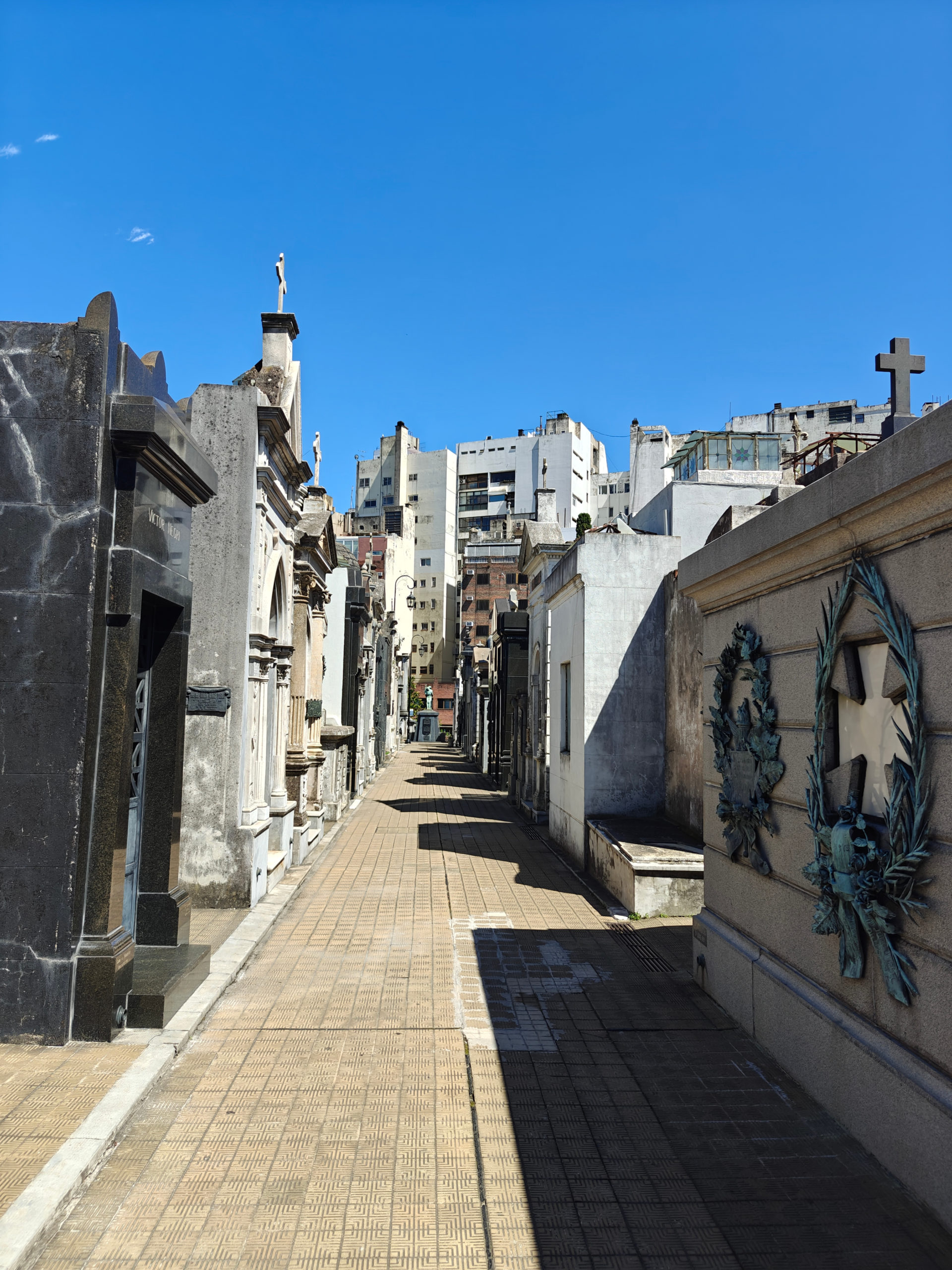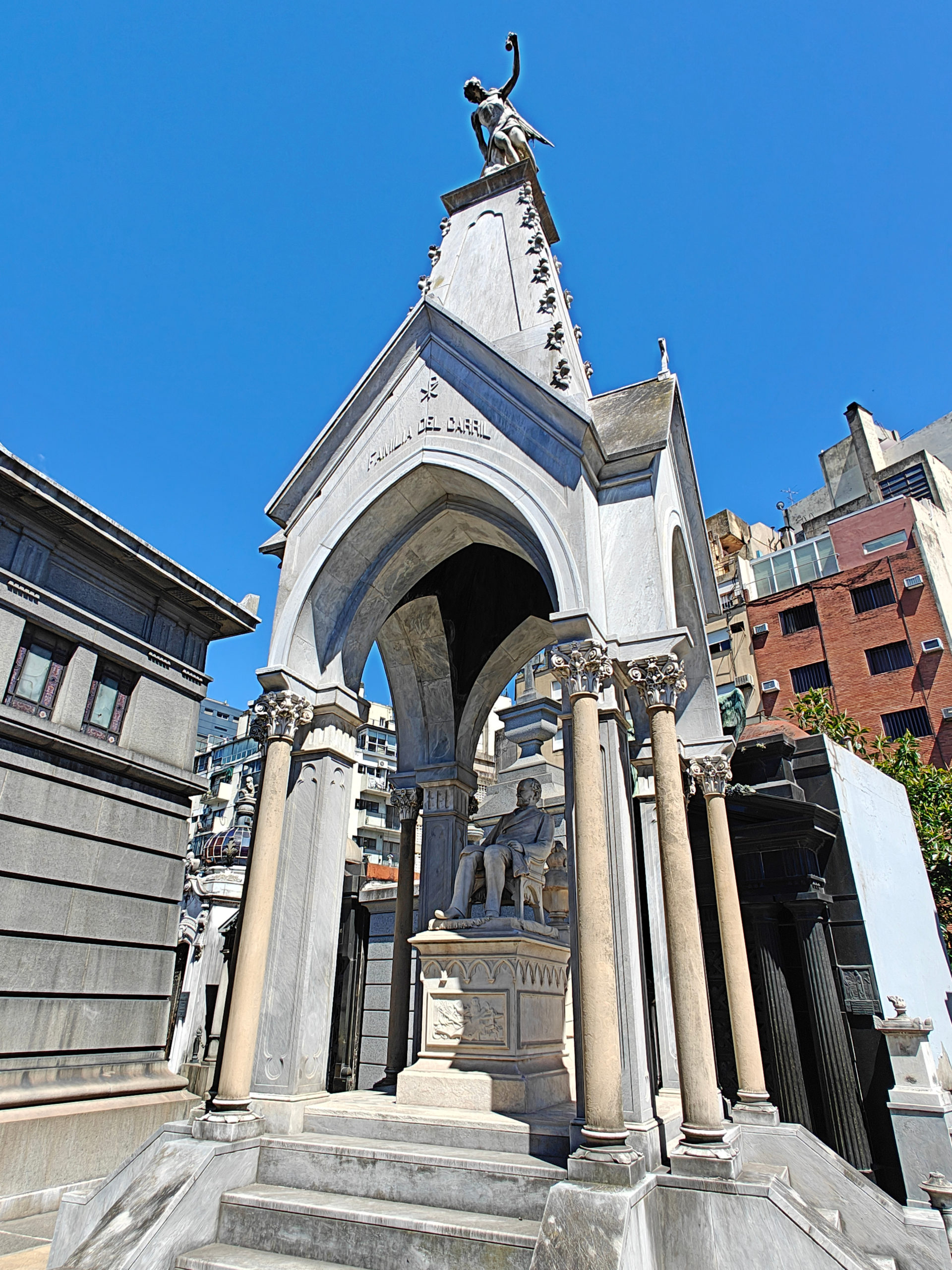 Daarna bezochten we het Cementerio de la Recoleta. De toegangsprijs is best pittig voor een kerkhof (16.000 pesos, zo’n 15 euro) maar het is dan ook de moeite waard. De wijk en de begraafplaats danken hun naam aan de recoletos, de paters recollecten of minderbroeders die hier na de onafhankelijkheid gingen wonen, in de nabijgelegen Basilica Nuestra Senora del Pilar, een 18e-eeuwse kerk. Wie zich een plaats heeft verworven op het Cementerio moet bij leven rijk zijn geweest en, wat zeker zo belangrijk is, tot de hogere klasse hebben behoord. Ook Eva Duarte, beter bekend als ‘Evita’, ligt hier begraven, en al komen de meeste toeristen voor haar graf, het is niets bijzonders, en ik heb er dan ook geen foto van genomen, in tegenstelling tot vele andere graven.