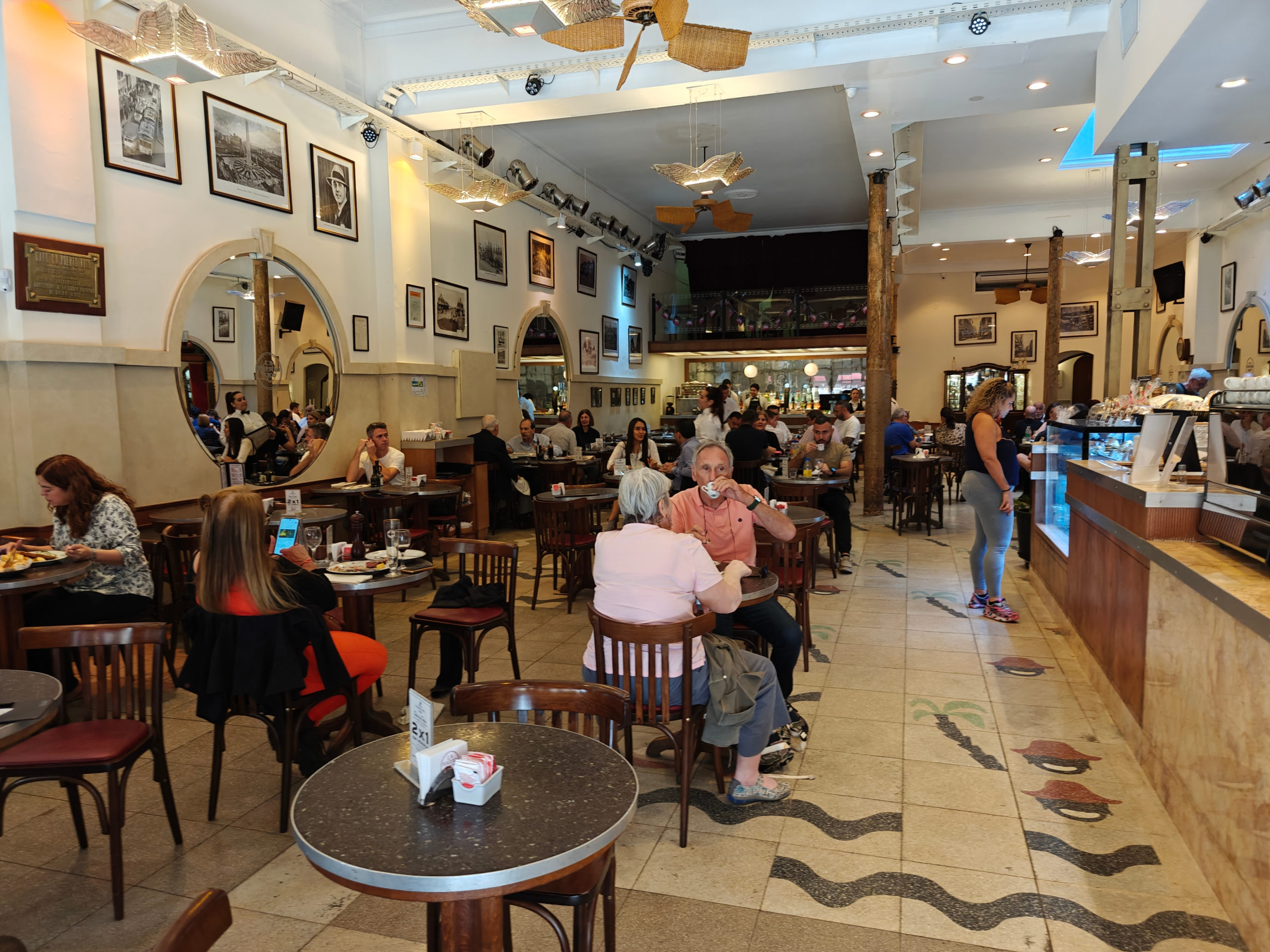 Dit café werd in 1887 opgericht door Gumersindo Cabedo, een Spanjaard die een bijzondere smaak voor koffie had ontwikkeld nadat hij een aantal jaren in Puerto Rico had gewoond. In de loop der jaren hebben belangrijke figuren uit de Argentijnse cultuur en geschiedenis hier aan tafel gezeten en genoten van de gebrande koffie, zoals de schrijvers Jorge Luis Borges, Victoria Ocampo en Adolfo Bioy Casares, de dichter en componist Enrique Cadícamo, de actrice Niní Marshall, en zelfs de toenmalige aartsbisschop van Buenos Aires, Jorge Bergoglio, later bekend als paus Franciscus. We werden bediend door een heel vriendelijke ober die mij complimenteerde met mijn Spaans. Hijzelf bleek uit Brazilië te komen, was intussen al decennia in Argentinië, waarvan de laatste 10 jaar als ober in La Puerto Rico. We kozen voor het dagmenu: een lekkere ensalada met een glas witte wijn, voor 11.800 pesos.