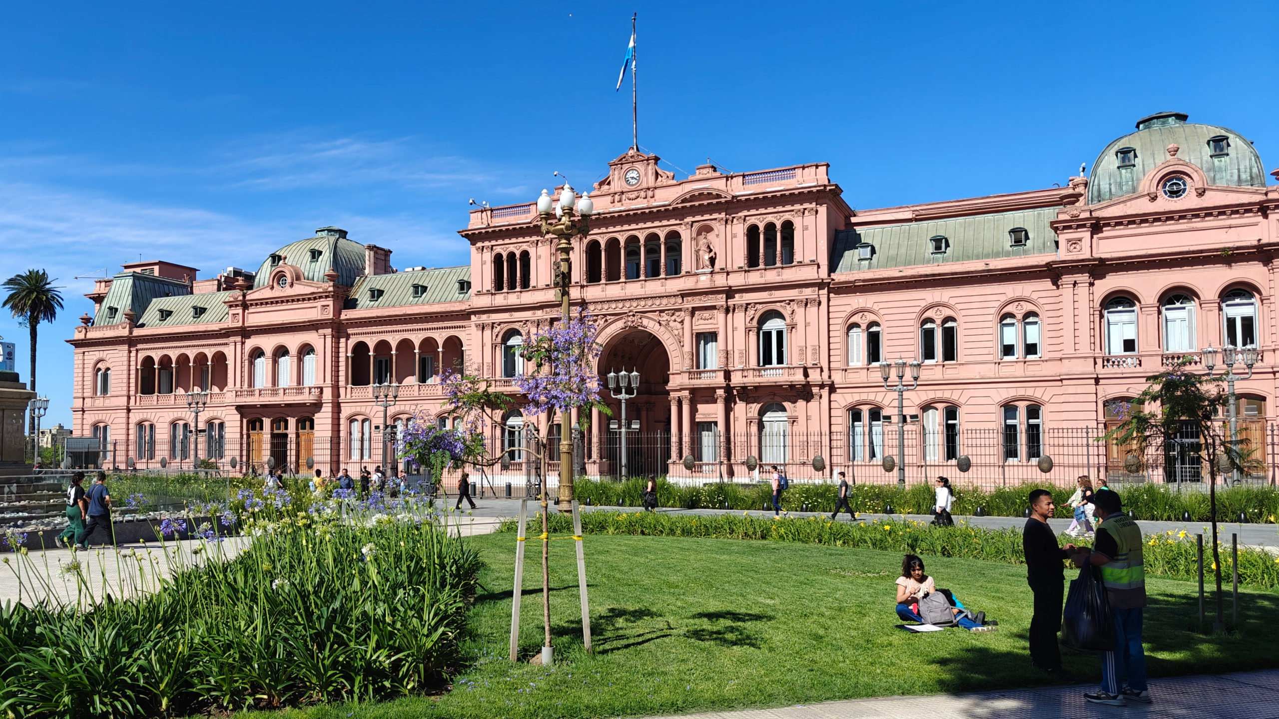 Aan de rand van het plein staat het Casa Rosado. De opvallende roze kleur, die het gebouw tijdens zonsondergang fel laat oplichten, kreeg het in 1873 ten tijde van de regeerperiode van Domingo Faustino Sarmiento. Op het balkon van Casa Rosada hield Evita Perón de toespraken die honderdduizenden Argentijnen tot tranen toe roerden. Haar man, president Juan Perón (1895-1974) werd geboren in de provincie Buenos Aires en ging op 15-jarige leeftijd naar de militaire school. Hier bleek hij uiterst talentvol en snel klom hij op in de militaire hiërarchie. In de jaren dertig was hij militair waarnemer in het fascistische Italië. In juni 1943 was hij als kolonel een belangrijke figuur in de militaire coup tegen het burgerbewind van Ramón Castillo. Dit werd nodig geacht, omdat de zittende president ernstig ziek was en weigerde de macht over te dragen aan zijn vicepresident, waardoor het land verviel in chaos. Peron was minister in de nieuwe regering. Hij werd echter op 9 oktober 1945 tot ontslag gedwongen door tegenstanders binnen de regering en kort daarna gearresteerd, maar massabetogingen dwongen zijn vrijlating af. Perón was zo populair dat hij kort daarna verkozen werd tot president van Argentinië op 24 februari 1946. Perón ontvouwde zijn politiek van sociale en economische hervormingen en claimde een derde weg te bewandelen, tussen kapitalisme en communisme. Hiertoe volgde hij een solidaristische en corporatistische lijn, die klassenverzoening en nationale eenheid tot doel had. Hij was stevig gekant tegen de Amerikanen en de Britten en voerde een nationalisatie van de industrie door, alsook een sterke industrialisatie van het land. Het peronisme is nog steeds een belangrijke factor in de Argentijnse politiek.