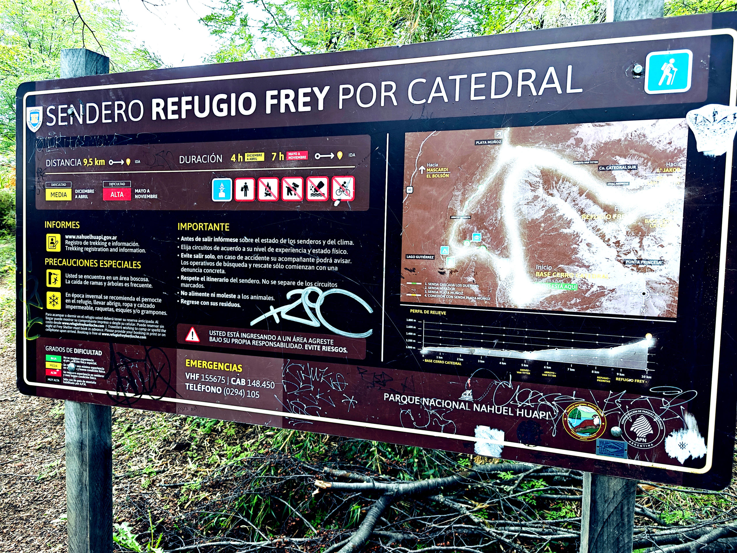 Ze gingen ook een wandeling maken. We vroegen of ze ook naar Refugio Frey gingen, waarop de man zei: “Mais c’est trop loin. Cela vous prendra au moins 8 heures.”. Toen ik dat dan in mijn wandelapp nog eens nakeek… bleek dat ik me ook op dat vlak slecht had voorbereid. Op de website waar ik de hike gevonden had stond “Voor een uitdagende hike kun je naar Refugio Frey. Deze tocht van 10 kilometer begint bij het skicentrum van Cerro Catedral, bereikbaar met bus 55. De hike duurt ongeveer 4 uur en voert door bossen met spectaculaire uitzichten op bergen en meren.” Wat ik me niet gerealiseerd had, was dat die 10 km en 4 uur de afstand en tijd was in het heengaan… maar dat je dat dus moest verdubbelen om via dezelfde weg terug te keren naar het beginpunt. Als je dit leest, denk je wellicht, uiteraard Kris, hoe dom kan je zijn. Tja, je hebt gelijk. Ik had dat moeten weten. Een flauw excuus is dat ik op mijn wandel-app (Wikiloc, een aanrader trouwens) altijd naar de lengte van een trail kijk, en die gaf 9,6 km aan. Maar dat was dus enkel. Zo goed als altijd doen we hikes in een lus, en dan is die lengte de totale afstand. Maar dit was dus geen lus. Hoedanook, slecht voorbereid, punt uit.