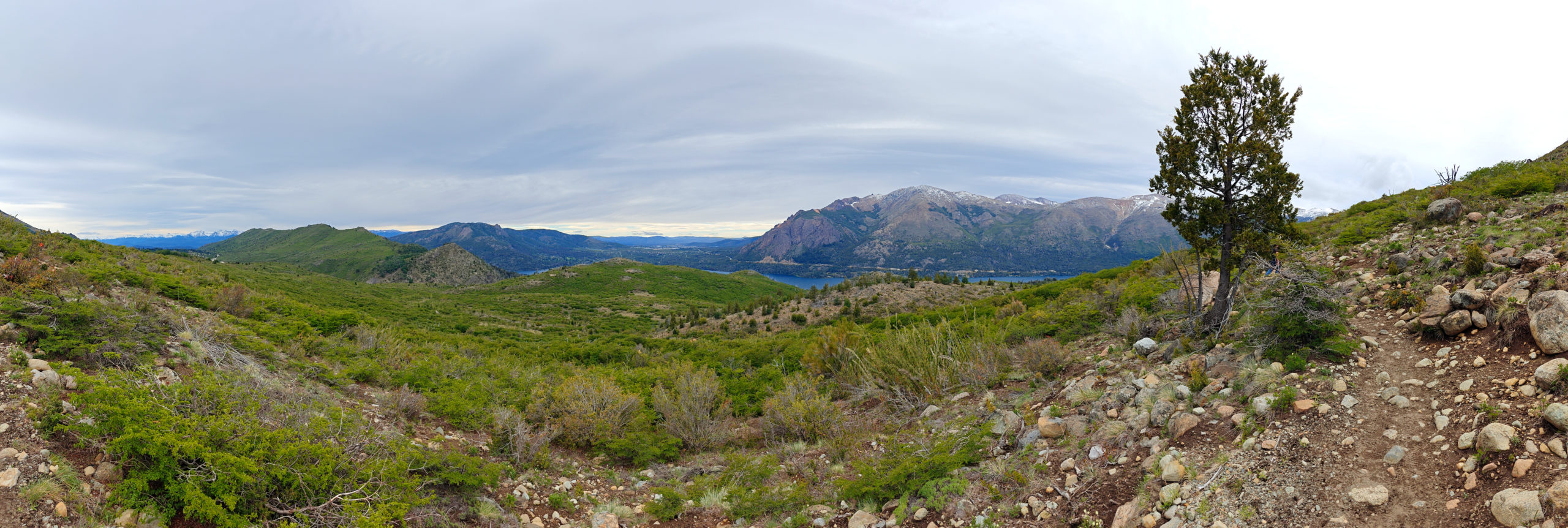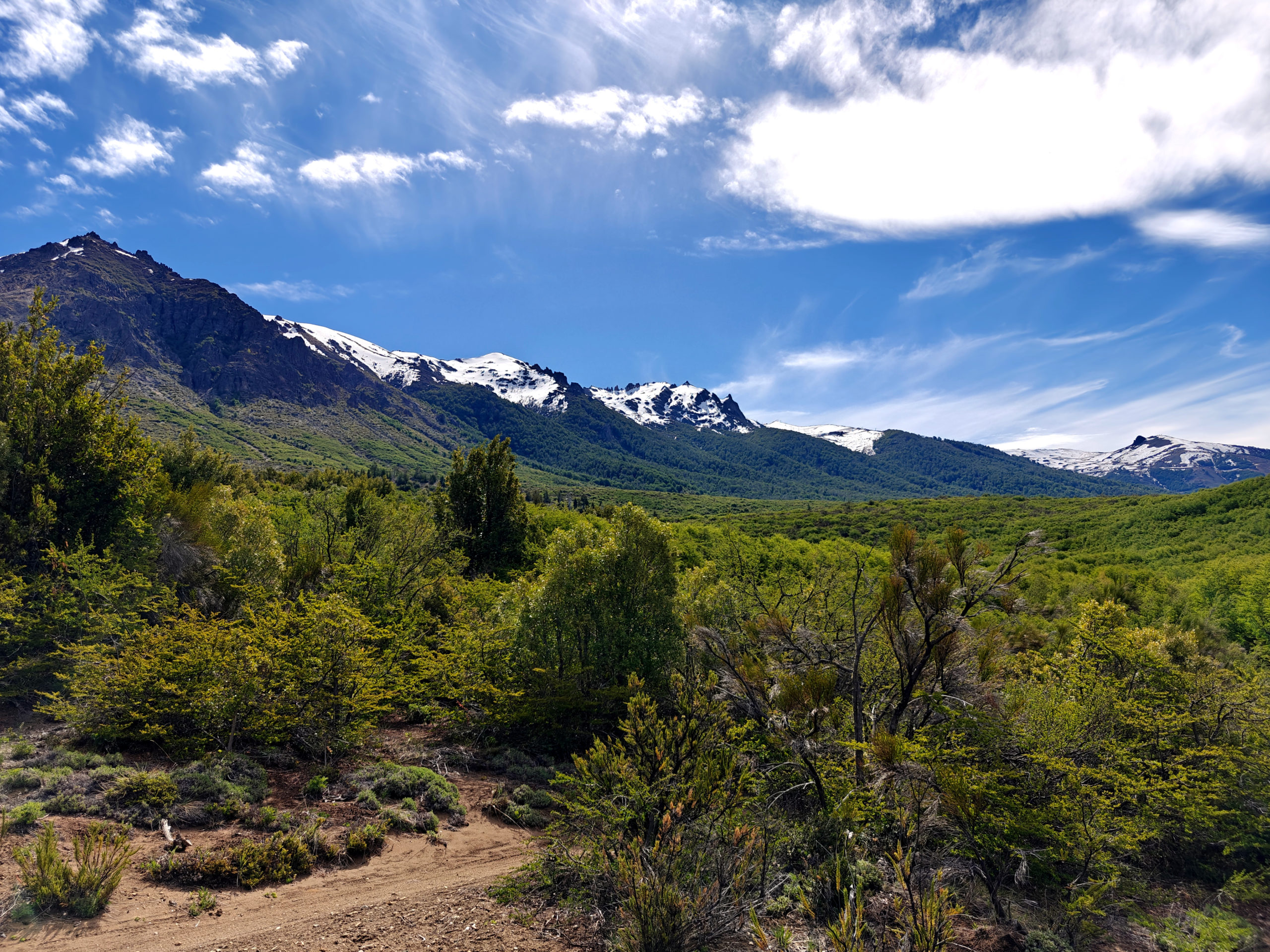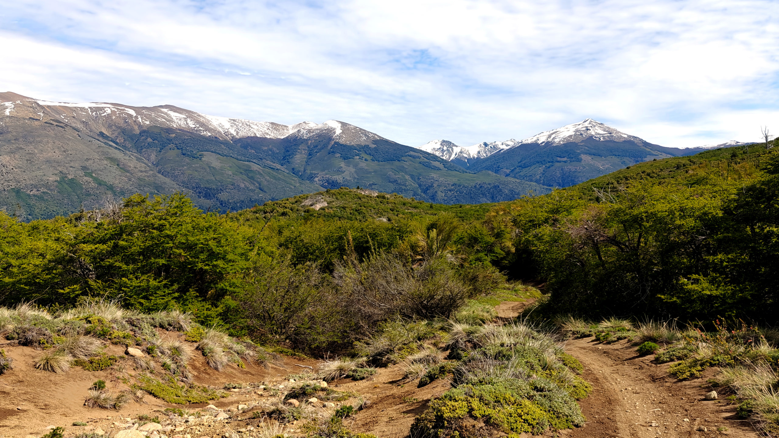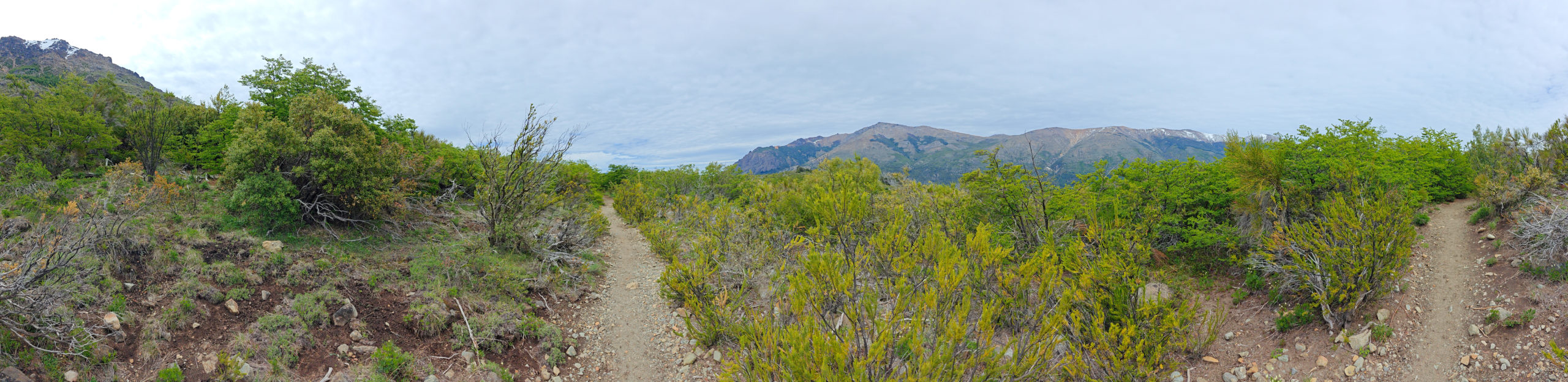 Het Franse koppel had een kortere, minder uitdagende route uitgestippeld van 14 km. Die vond ik ook vrij snel terug in Wikiloc, en we besloten van samen te vertrekken. We liepen eerst naar een informatiepunt om te vragen of de trail wel open was (soms zijn trails gesloten o.w.v. slechte weeromstandigheden of andere problemen) en er bleek geen probleem te zijn. We vertrokken dan samen op weg naar het beginpunt. Dat lag aan het einde van de straat waar de supermarkt ook lag en toen we daar passeerden, kwam plots de vrouw van achter de kassa uit de winkel gelopen en riep ons achterna: “funciona ahora, funciona ahora” (het werkt nu!). Bijzonder vriendelijk dat ze die moeite deed. Wij dus opnieuw naar binnen en nu konden we inderdaad onze kaart opladen tot het maximum. We zouden dus vanavond met de bus terug naar Bariloche kunnen.