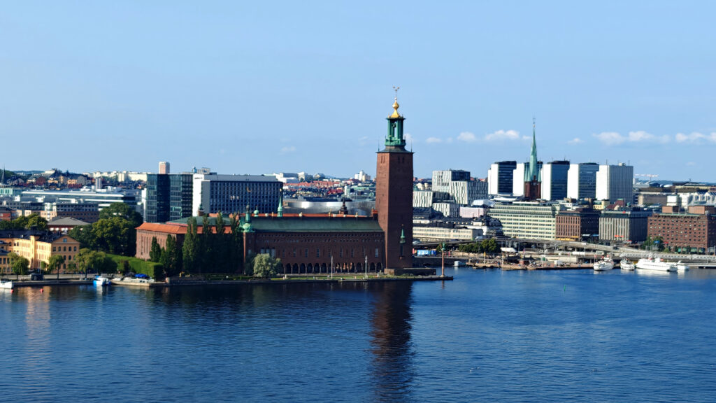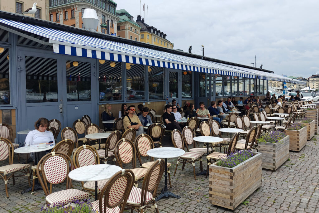Gamla Stan dateert uit de 13e eeuw, met documenten die teruggaan tot 1252 toen Stockholm werd gesticht door Birger Jarl. In de Middeleeuwen was dit het belangrijkste handels- en bestuurlijke centrum van Zweden. Het staat bekend om smalle, kronkelige kasseienstraatjes en kleurrijke middeleeuwse panden in Noord-Duitse stijl met Zuid-Europese kleuren (oranje en geel). Waar ik niet op gerekend had, was dat het ook één grote tourist trap is. Hele hordes toeristen worden met bussen afgezet en overspoelen dan dit stadsdeel. Ik had Café Schweizer geselecteerd om te lunchen, maar dat bleek dus geen goed idee. Volgens hun website staat dat Café Schweizer “bekend [staat] om zijn charmante, historisch aandoende inrichting en de kenmerkende etalage vol met verse bloemen en fruit, vooral sinaasappels. Binnen vind je een gezellige, authentieke sfeer met een vleugje artistieke flair”. Wij vonden binnen vooral veel lawaai, veel toeristen en een wat bedompte sfeer. Lunchen daar zagen we dus niet zitten. Ook een alternatief, Grillska Huset, bleek een tourist trap. Gelukkig vonden we via Google Maps dan Skeppsbro bageri waar we buiten op een terrasje in wat rustigere omstandigheden een laxsmörgås konden eten, een typisch broodje met zalm.