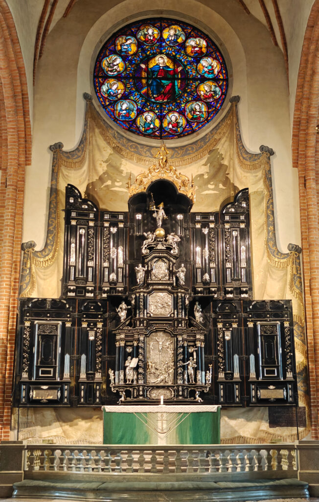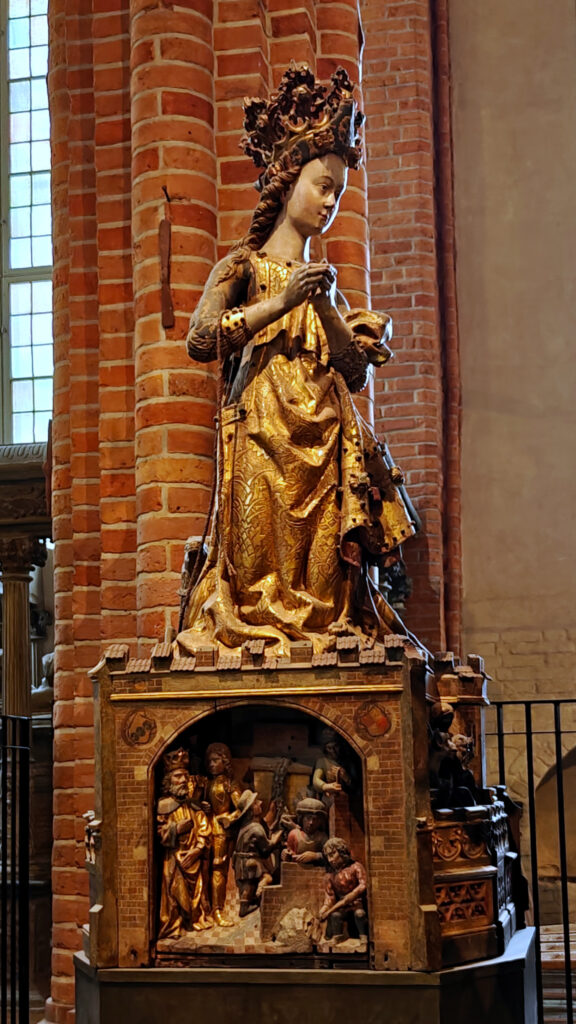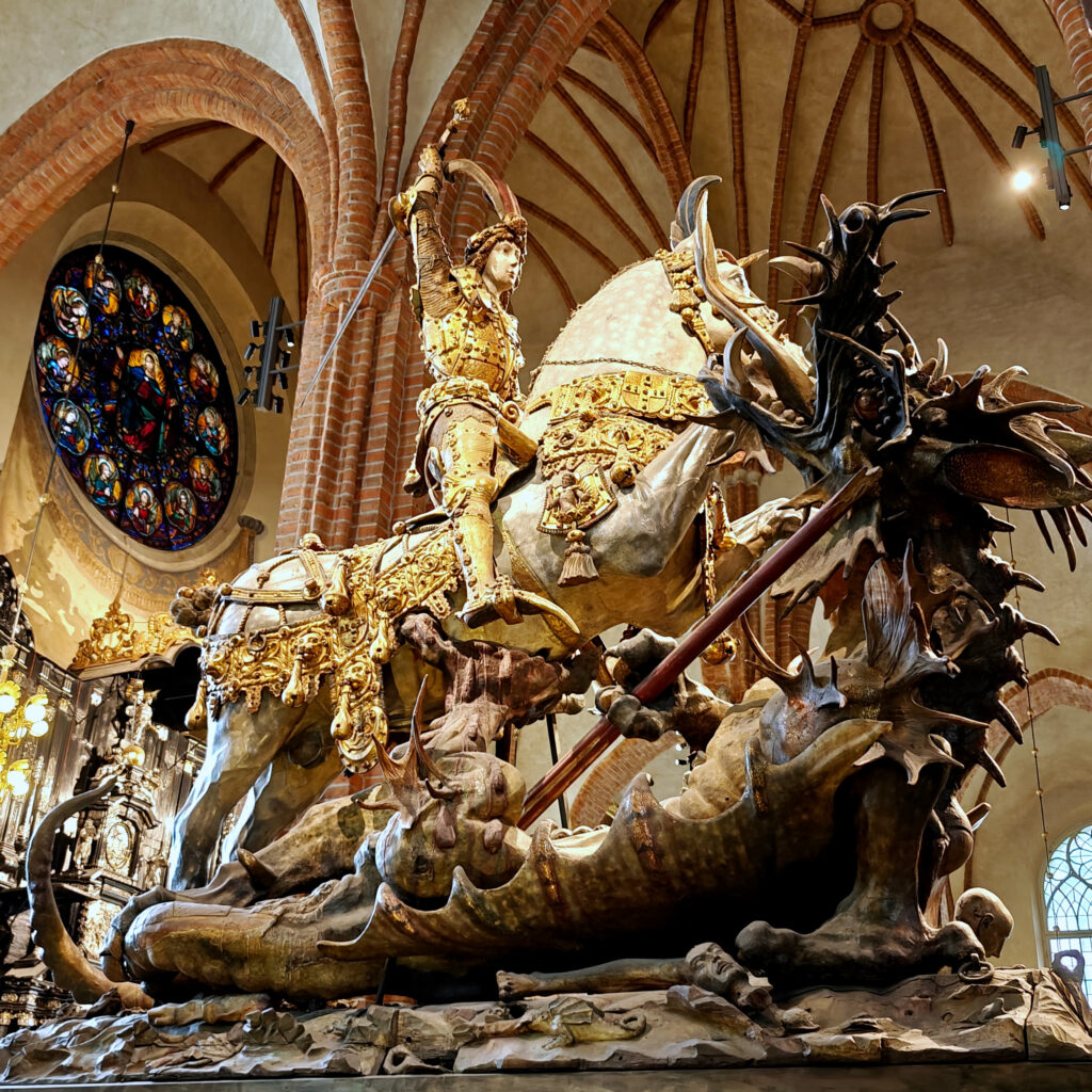 Na nog wat verder doorworstelen van hordes toeristen kwamen we in de Storkyrkan, officieel bekend als de kathedraal van Stockholm of Sankt Nikolai kyrka. Hier vinden de koninklijke huwelijken en kroningen plaats. De bouw begon rond 1279 en de inwijding volgde in 1306. De buitenkant is niet erg de moeite waard, maar binnenin valt wel wat te zien. Het meest opmerkelijke is de beeldengroep van de Heilige Joris die de draak verslaat, ter herdenking van de Zweedse overwinning op de Denen (de draak) in de Slag bij Brunkeberg, in 1471. Het is een houtsculptuur van Bernt Notke, meesterbeeld houwer uit Lübeck en wordt beschouwd als een van de topstukken van de Noord-Europese middeleeuwse beeldhouwkunst. Verder is er een zilveren altaarstuk, zijn er speciale plaatsen voor de koning en de koningin en is er een barokke preekstoel uit 1703.