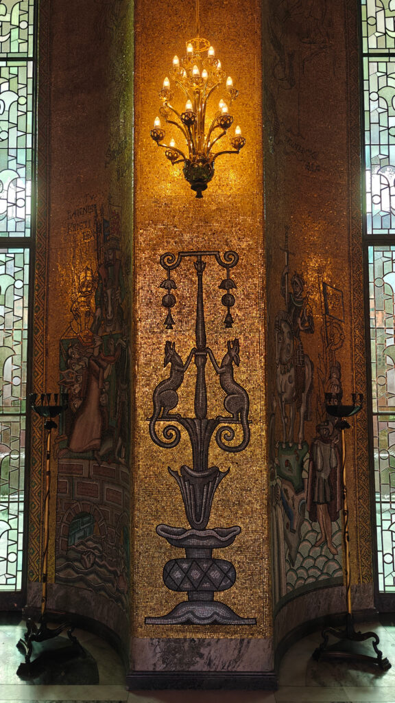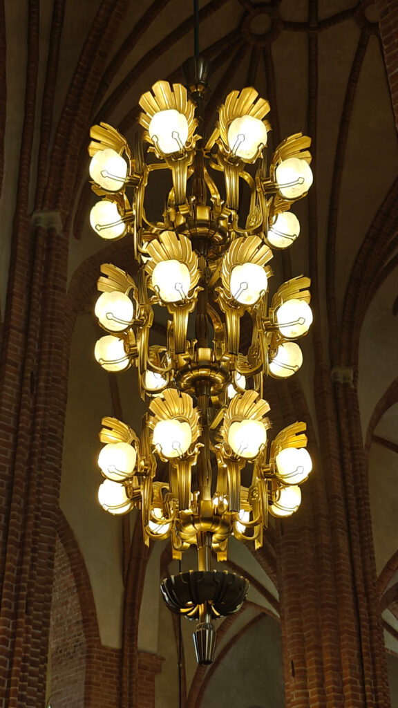 Om 16u had ik een gegidste rondleiding geboekt in het Stadshuset, de enige manier om de zalen binnenin te kunnen zien. Het stadhuis, met zijn koperen daken en rode baksteen, is een van de grote blikvangers van de stad. Het werd tussen 1911 en 1923 gebouwd en heeft een sobere vierkante hoektoren van106 m hoog met een koepel met daarop drie vergulde kronen, het symbool van Zweden. Binnenin is de weelderigste zaal de Gyllene Salen (Gouden Zaal), bezaaid met 18,6 miljoen stukjes glas en bladgoud van kunstenaar Einar Forseth. Elk jaar gaan in deze zaal de Nobelprijswinnaars, Koninklijke Hoogheden en gasten dansen na het diner in de Blauwe zaal van het stadhuis ter gelegenheid van de uitreiking van de Nobelprijzen.