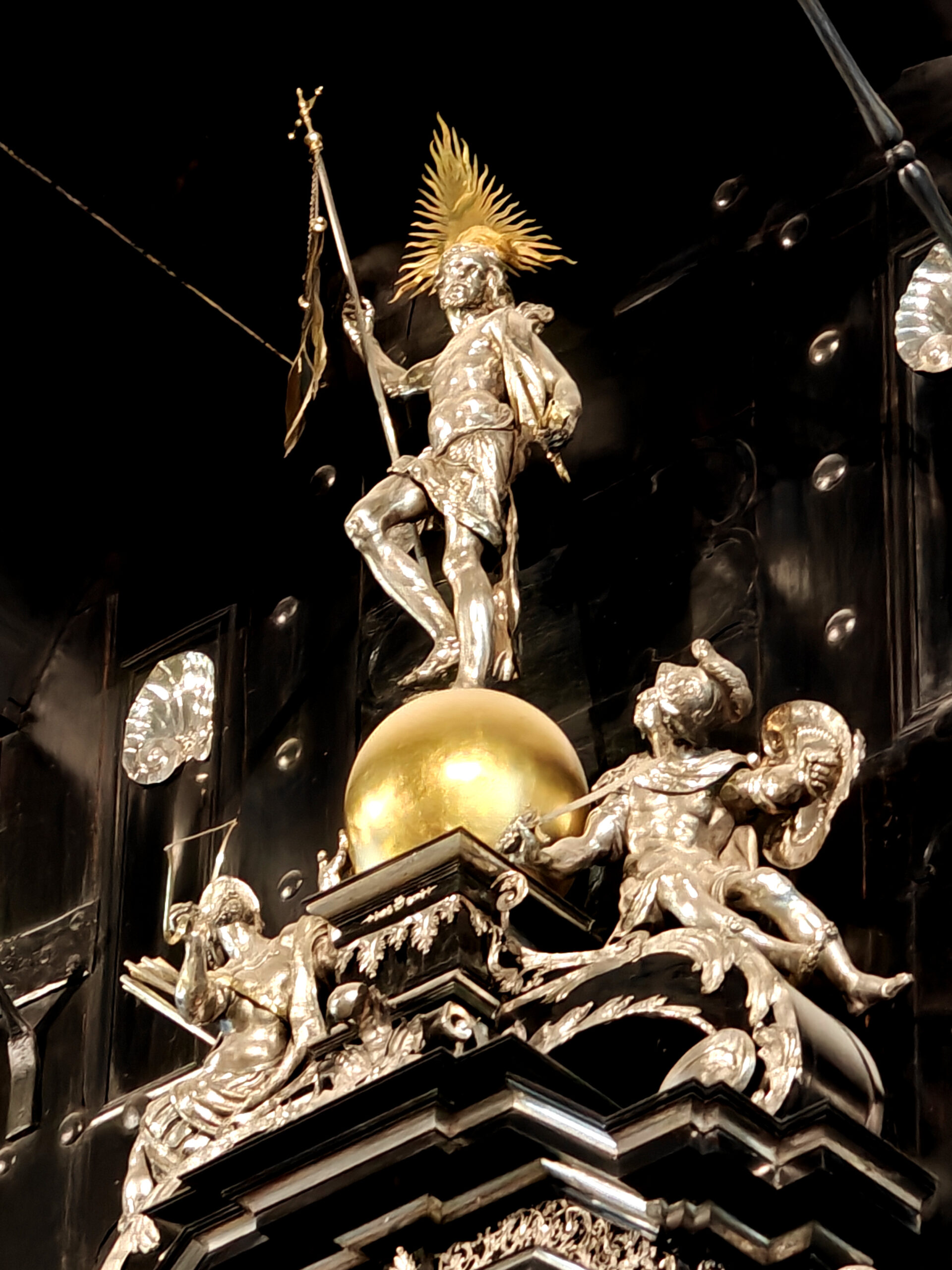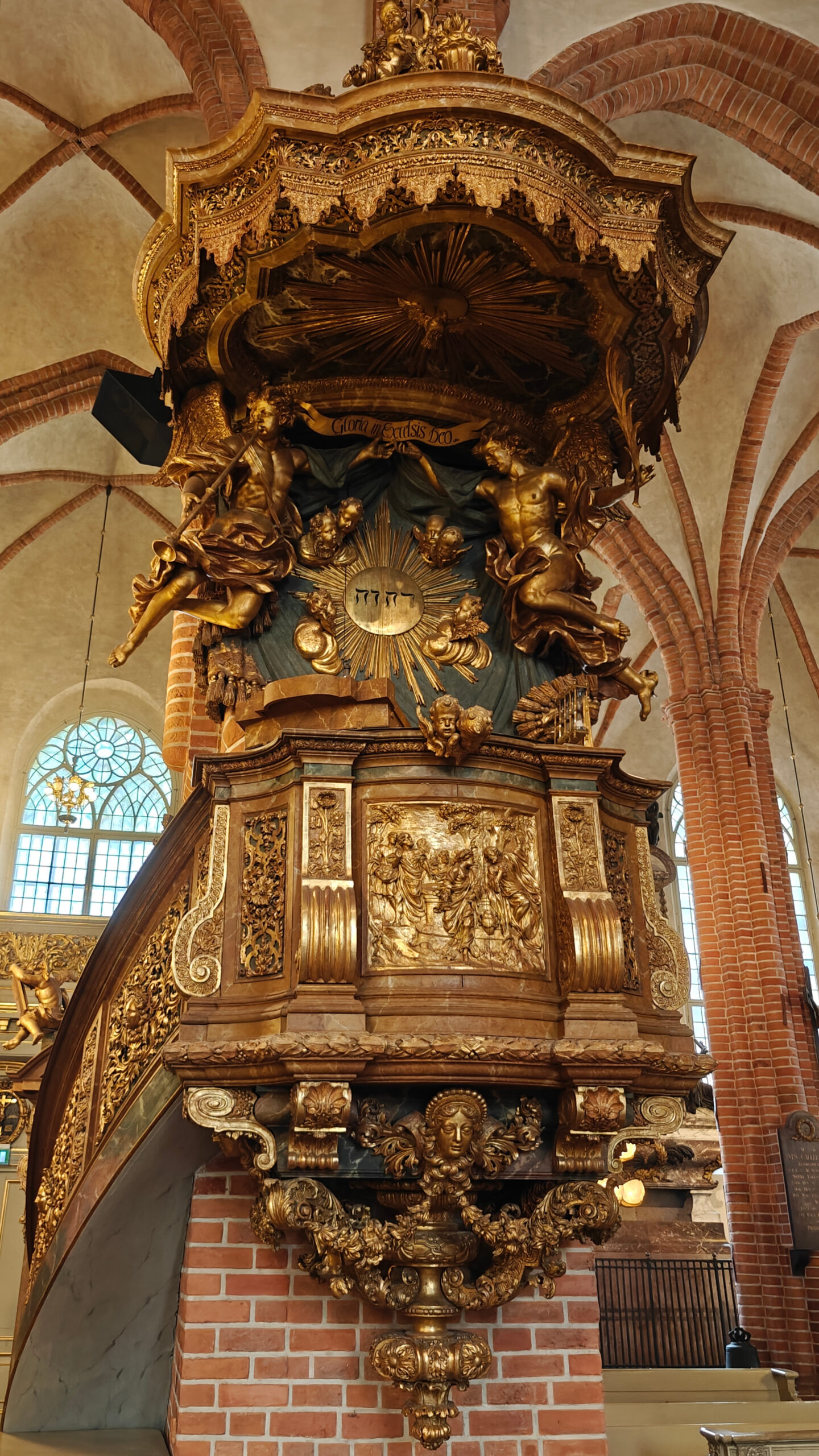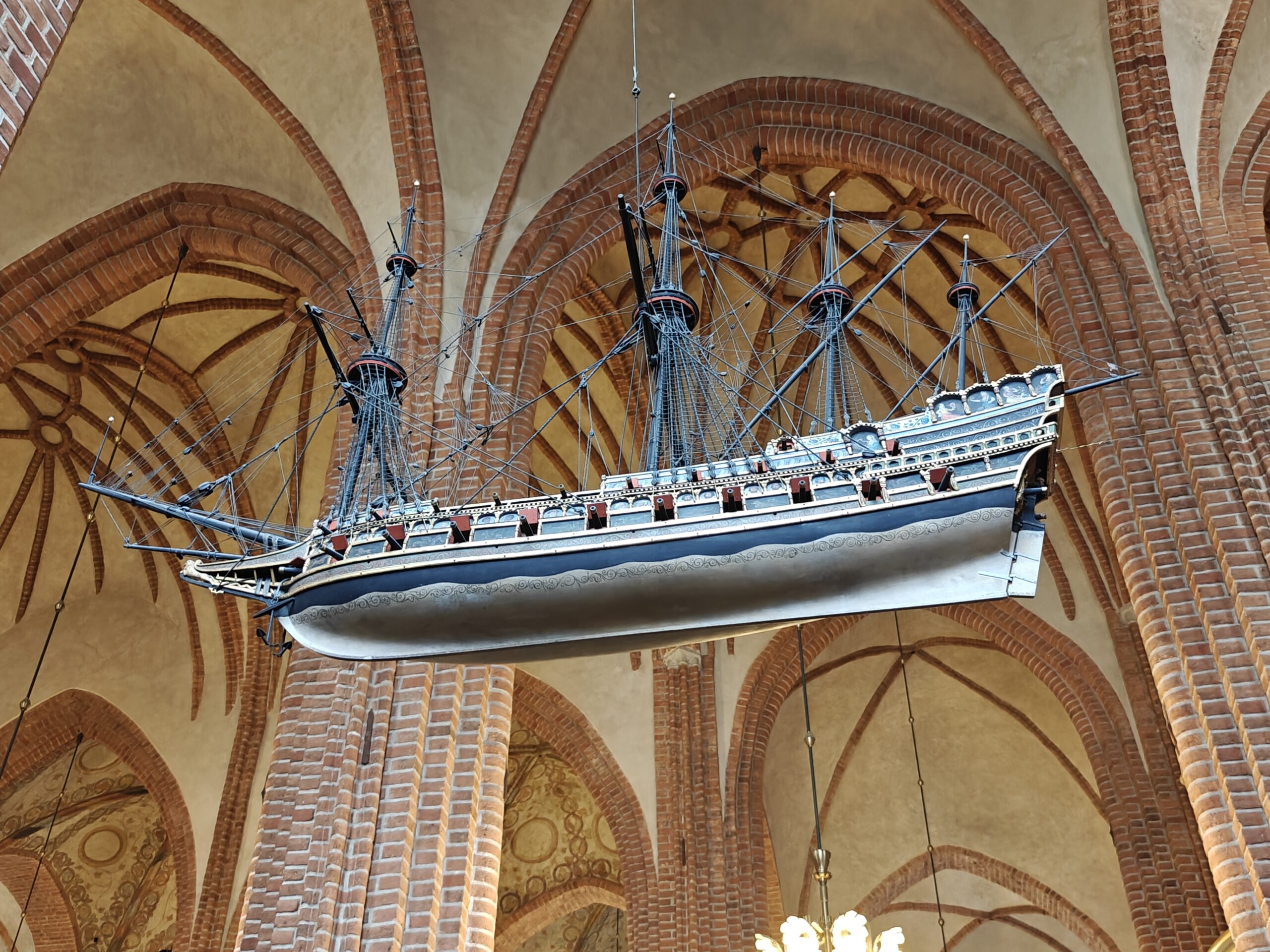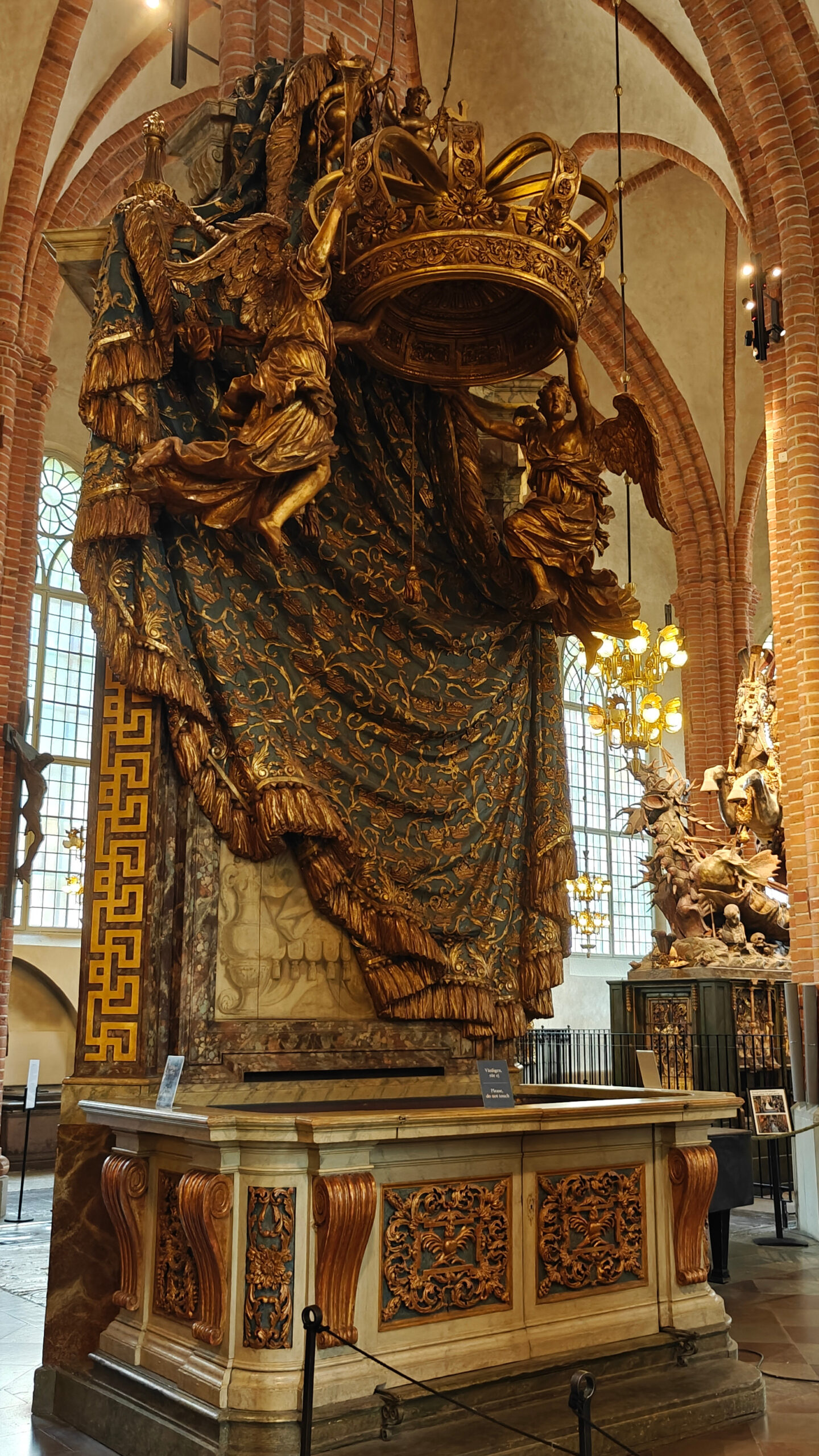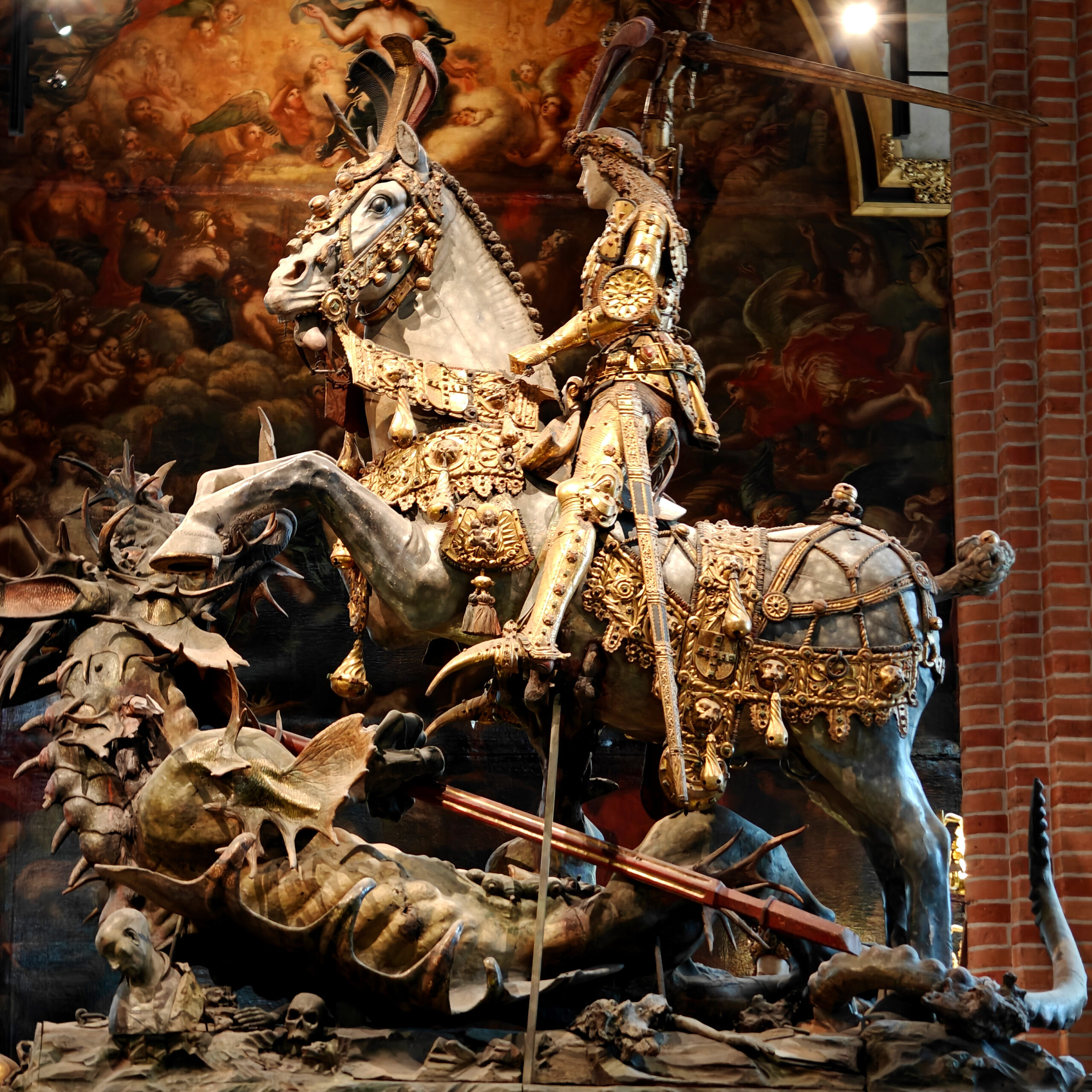 Na nog wat verder doorworstelen van hordes toeristen kwamen we in de Storkyrkan, officieel bekend als de kathedraal van Stockholm of Sankt Nikolai kyrka. Hier vinden de koninklijke huwelijken en kroningen plaats. De bouw begon rond 1279 en de inwijding volgde in 1306. De buitenkant is niet erg de moeite waard, maar binnenin valt wel wat te zien. Het meest opmerkelijke is de beeldengroep van de Heilige Joris die de draak verslaat, ter herdenking van de Zweedse overwinning op de Denen (de draak) in de Slag bij Brunkeberg, in 1471. Het is een houtsculptuur van Bernt Notke, meesterbeeld houwer uit Lübeck en wordt beschouwd als een van de topstukken van de Noord-Europese middeleeuwse beeldhouwkunst. Verder is er een zilveren altaarstuk, zijn er speciale plaatsen voor de koning en de koningin en is er een barokke preekstoel uit 1703.