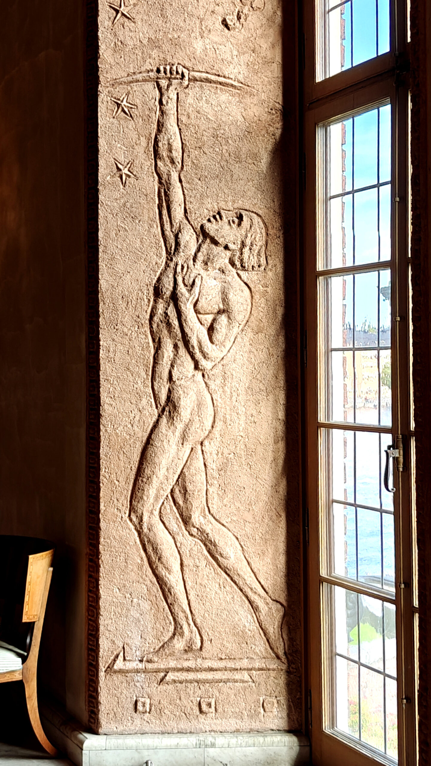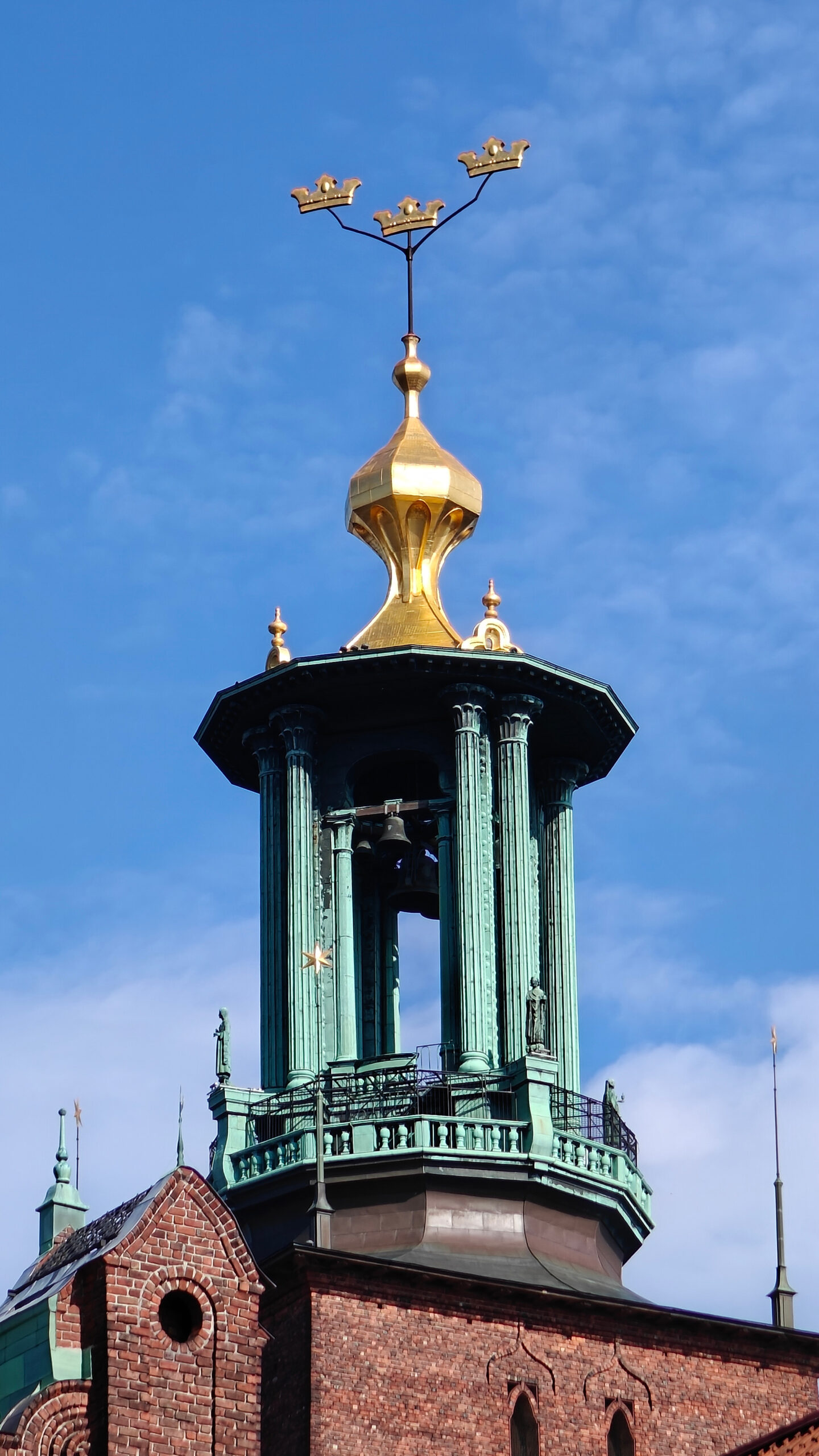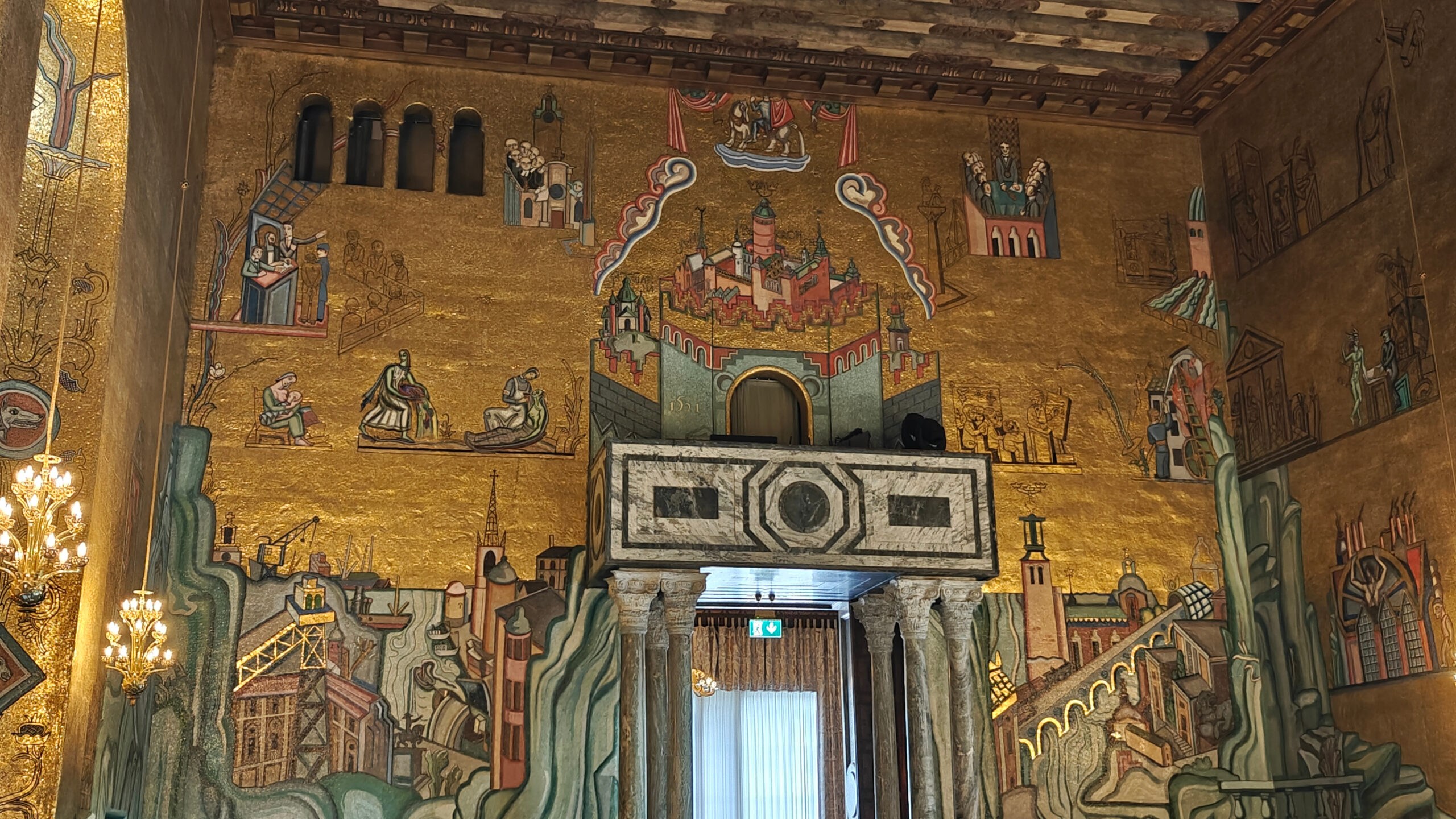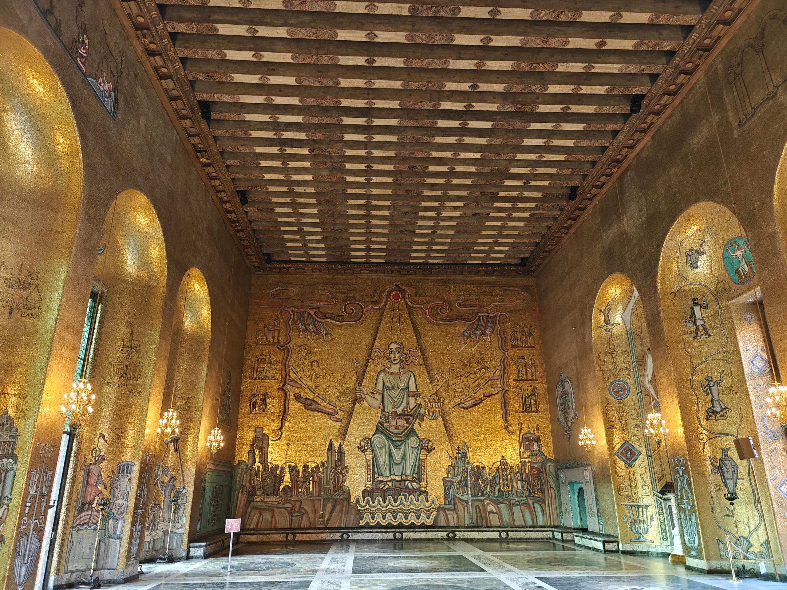 Om 16u had ik een gegidste rondleiding geboekt in het Stadshuset, de enige manier om de zalen binnenin te kunnen zien. Het stadhuis, met zijn koperen daken en rode baksteen, is een van de grote blikvangers van de stad. Het werd tussen 1911 en 1923 gebouwd en heeft een sobere vierkante hoektoren van106 m hoog met een koepel met daarop drie vergulde kronen, het symbool van Zweden. Binnenin is de weelderigste zaal de Gyllene Salen (Gouden Zaal), bezaaid met 18,6 miljoen stukjes glas en bladgoud van kunstenaar Einar Forseth. Elk jaar gaan in deze zaal de Nobelprijswinnaars, Koninklijke Hoogheden en gasten dansen na het diner in de Blauwe zaal van het stadhuis ter gelegenheid van de uitreiking van de Nobelprijzen.