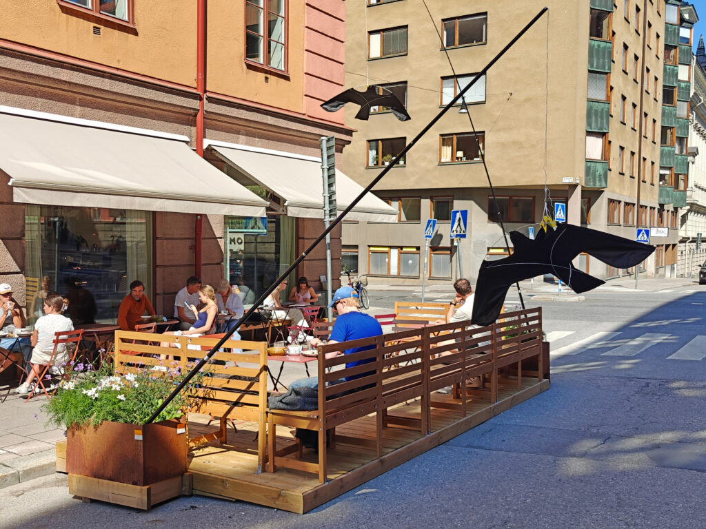 In Södermalm vind je op de oostkant een aantal hobbelige klinkerstraatjes die nog dateren uit de middeleeuwen, met een reeks mooie houten huisjes. Bij Fjällgatan kan je ook van een uitzicht genieten over Skeppsbron, Skeppsholmen en Djurgården, maar ik heb daar geen enkele foto gemaakt: de views vanop de overzetboot gisteren waren mooier. De toeristen die in drommen door autobussen op de plek worden afgezet, waar ze dan “five minutes” hebben om foto’s te maken, deden dat allemaal wel. Wij maakten een paar mooie of leuke foto’s in de rest van Södermalm, op plaatsen waar die toeristen niet komen.