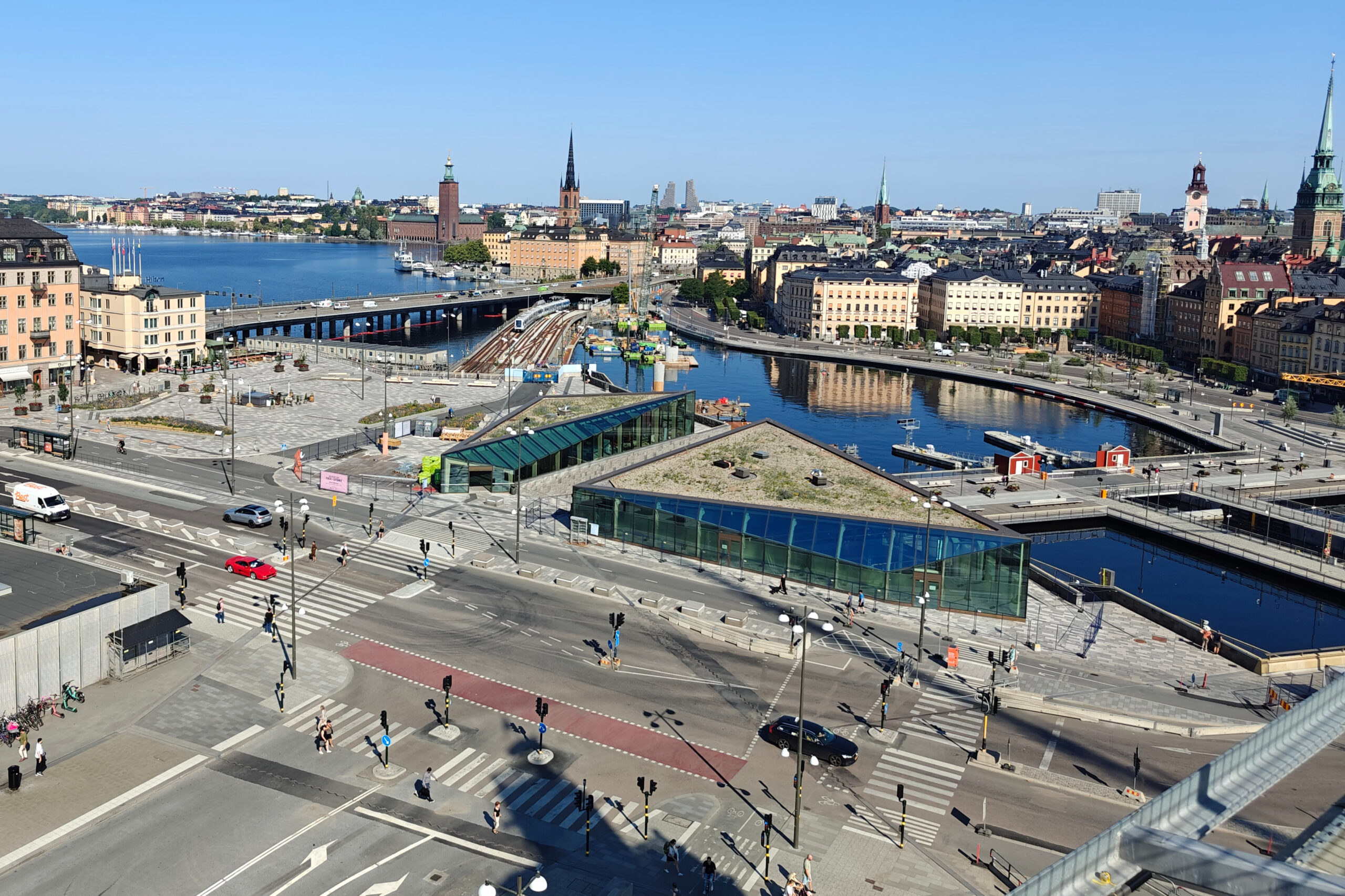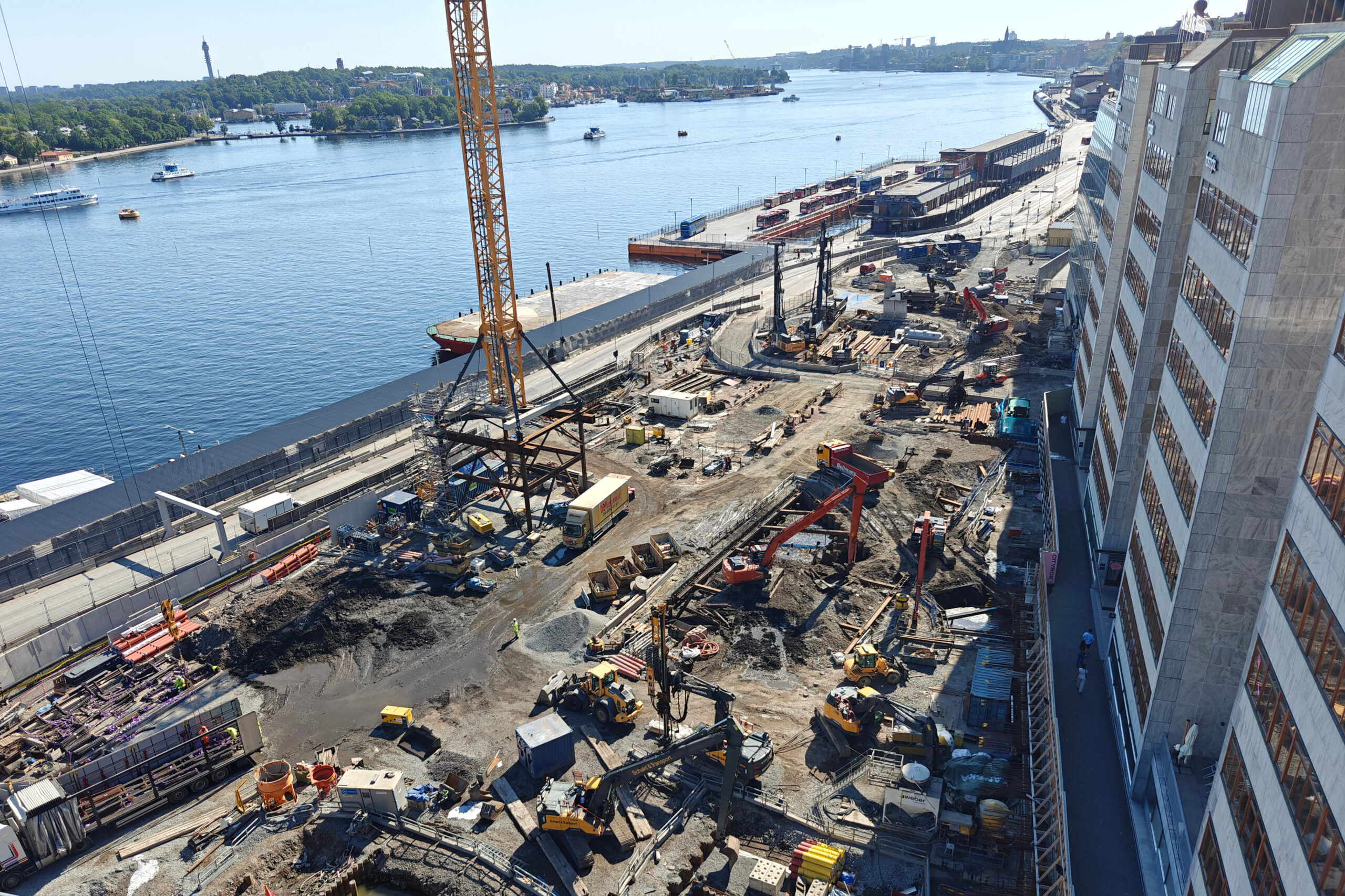 Maar we begonnen de dag dus met een wandeling door Södermalm. Het wordt vaak afgekort tot “Söder” en is een groot eiland in het zuiden van het centrum van Stockholm. Het gebied ligt direct onder Gamla Stan (de oude stad) en telt bijna 100.000 inwoners, waarmee het één van de dichtstbevolkte plekken van Scandinavië is. Ook ons hotel ligt in Södermalm, net zoals Slussen, wat al jarenlang een immense bouwput is (zie het verslag van 15 juli). We namen de metro tot Slussen en bekeken de werkzaamheden vanop de loopbrug naar Katarinahissen, een iconische publieke lift die het lager gelegen Slussen-gebied met Mosebacke Torg op Södermalm verbindt. De lift is 38m hoog. De eerste Katarinahissen (hiss = lift in het Zweeds) werd gebouwd in 1883 door de Belgische firma Lecoq & Comp en was meteen een bezienswaardigheid. In 1933 werd de lift vervangen door een moderner exemplaar. Die werd in 2023 intensief gerenoveerd.