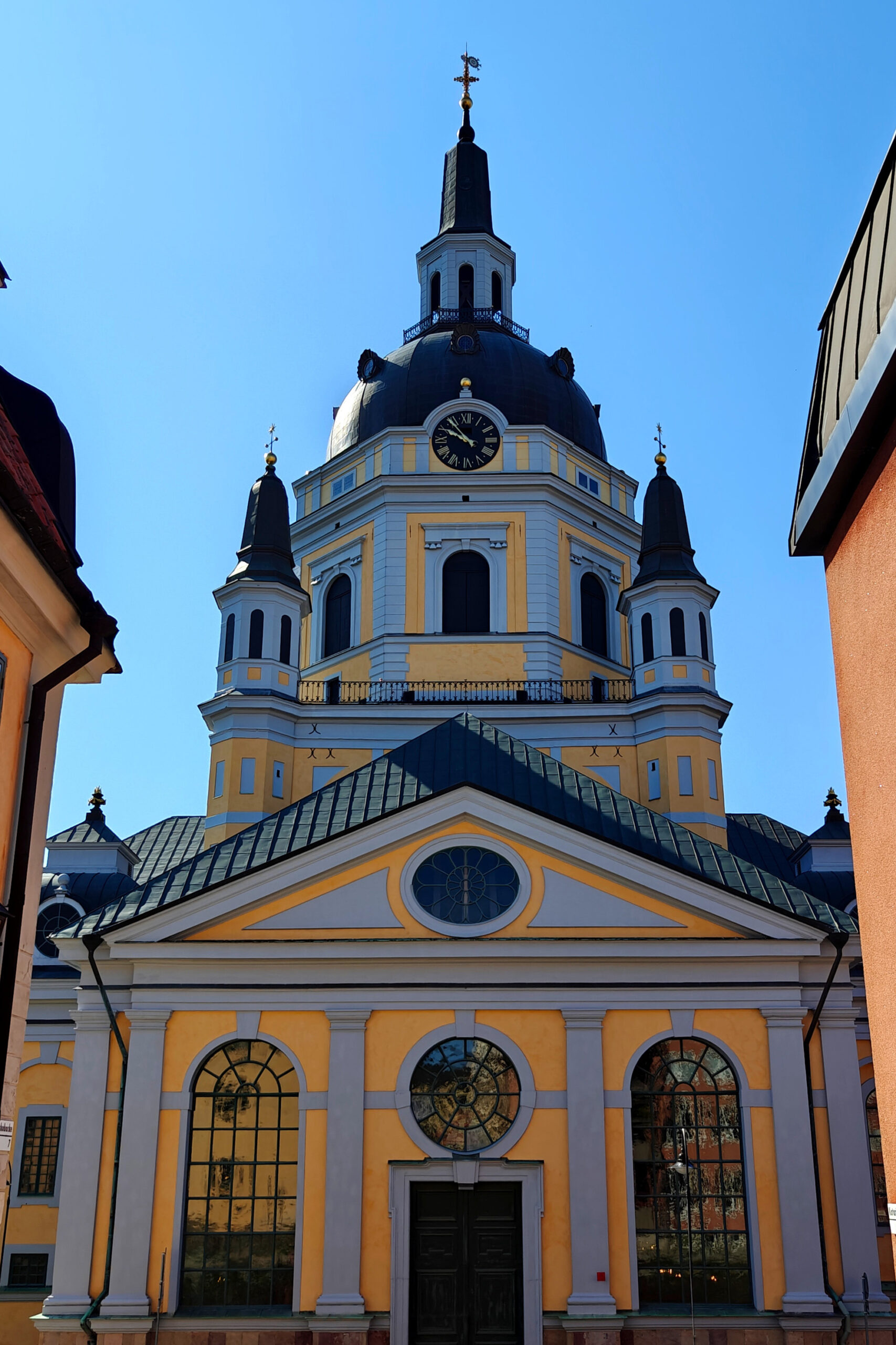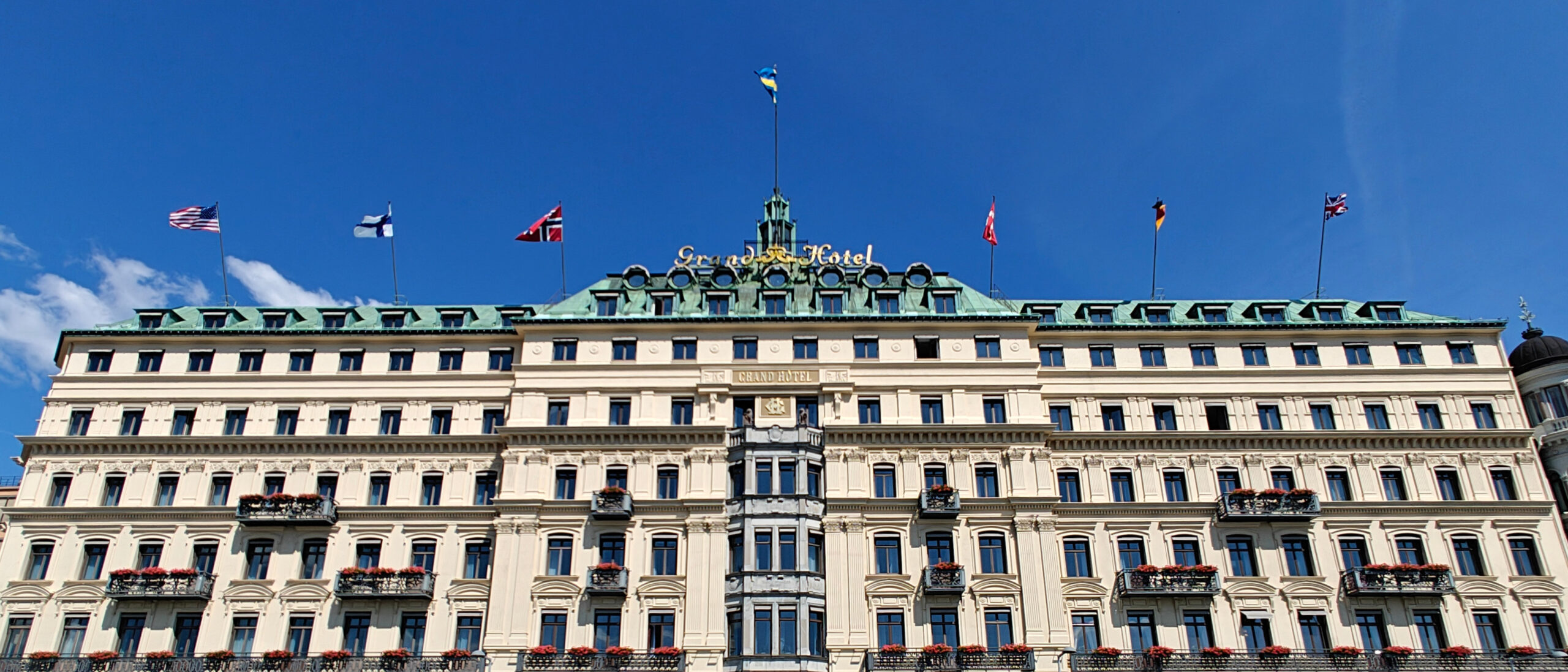 We bleven uiteindelijk minder lang dan voorzien in het Nationaal museum, en dus hadden we nog ruim een half uur over. We besloten om de wandeling in Gamla Stan die we eergisteren in de motregen deden, nog eens over te doen nu de zon overvloedig scheen, omdat dat misschien mooiere foto’s zou opleveren. Maar ik heb geen nieuwe foto’s meer gemaakt: het resultaat bleef min of meer hetzelfde en ik had sowieso het verslag over die dag al gepost op de blog. Ik zag het niet zitten om daar alle foto’s te vervangen door nieuwe foto’s die amper verschilden. Allen op weg naar Gamla Stan zag ik nog een paar mooie, leuke of absurde dingen:
