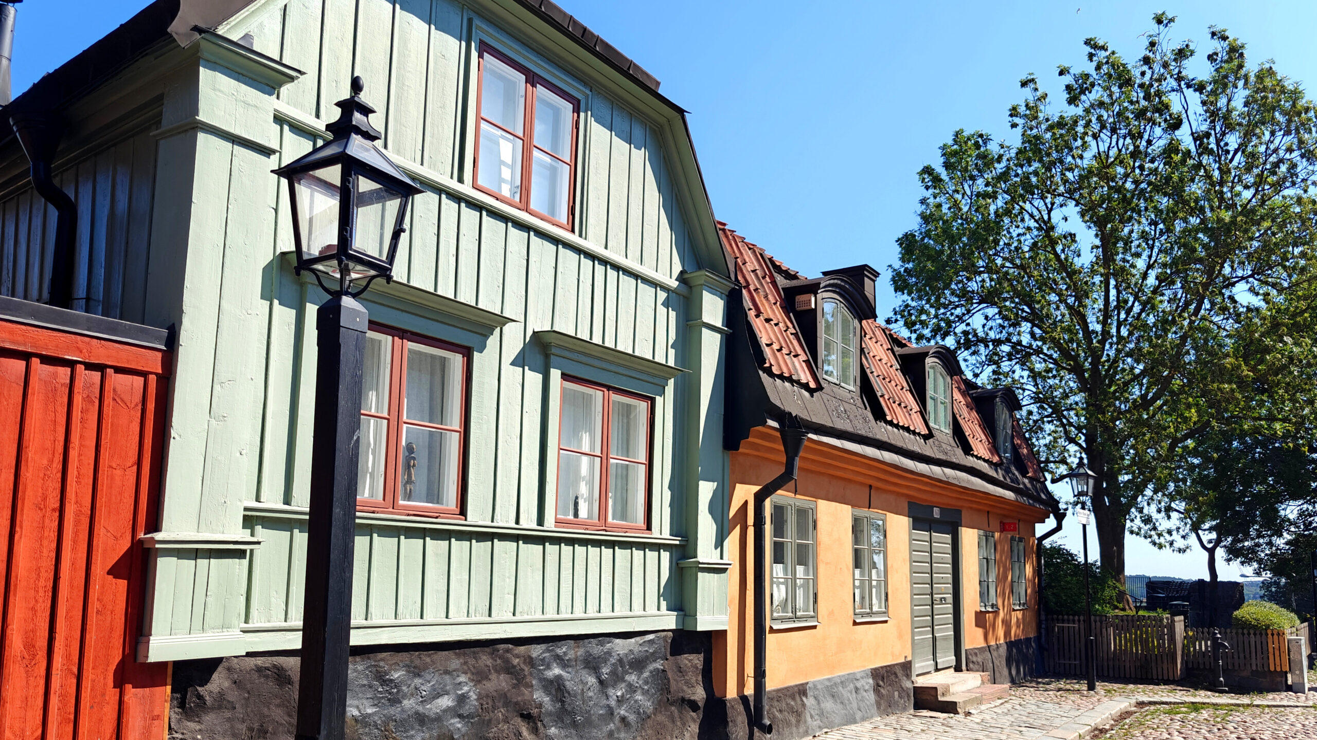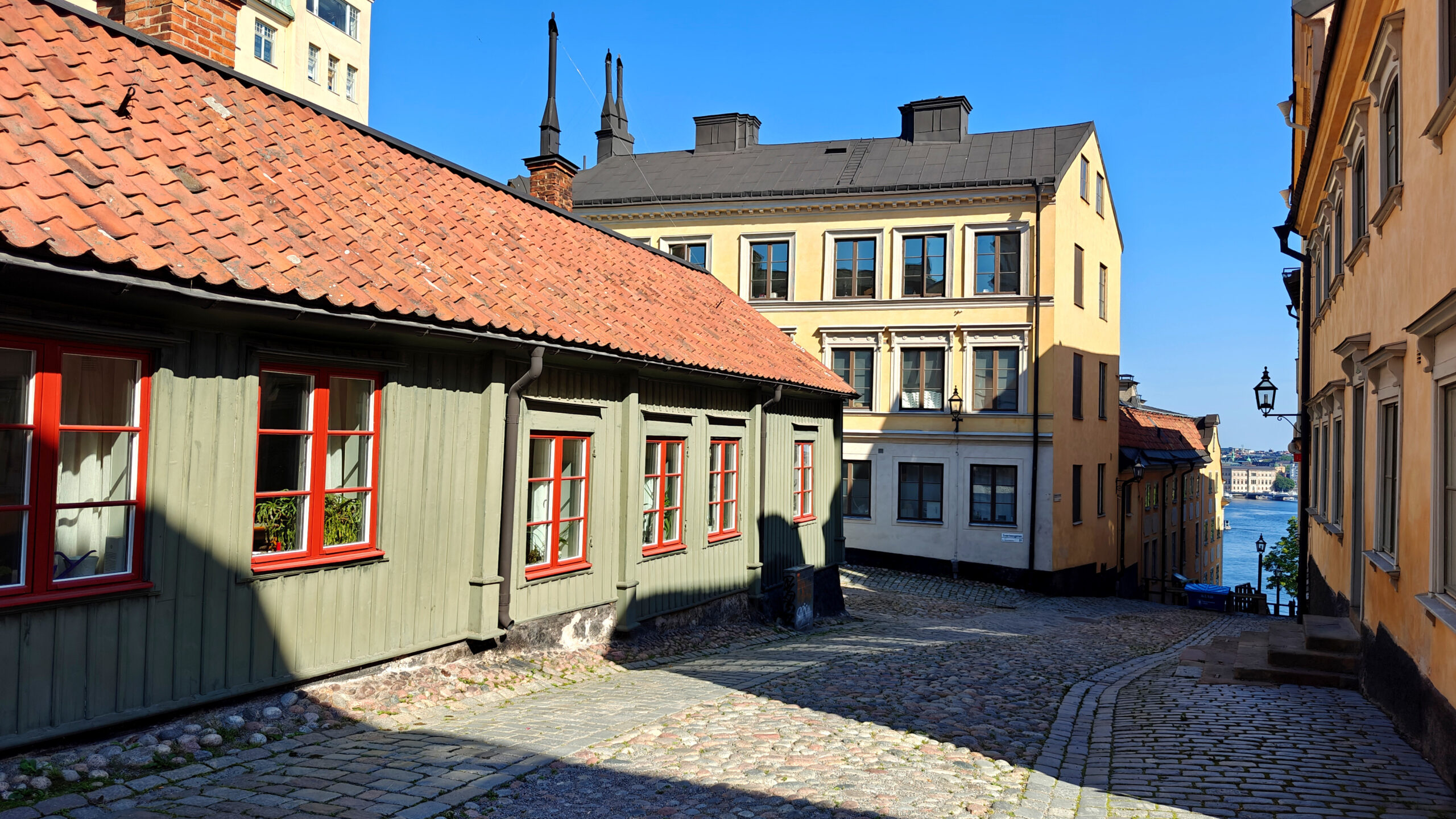 In Södermalm vind je op de oostkant een aantal hobbelige klinkerstraatjes die nog dateren uit de middeleeuwen, met een reeks mooie houten huisjes. Bij Fjällgatan kan je ook van een uitzicht genieten over Skeppsbron, Skeppsholmen en Djurgården, maar ik heb daar geen enkele foto gemaakt: de views vanop de overzetboot gisteren waren mooier. De toeristen die in drommen door autobussen op de plek worden afgezet, waar ze dan “five minutes” hebben om foto’s te maken, deden dat allemaal wel. Wij maakten een paar mooie of leuke foto’s in de rest van Södermalm, op plaatsen waar die toeristen niet komen.