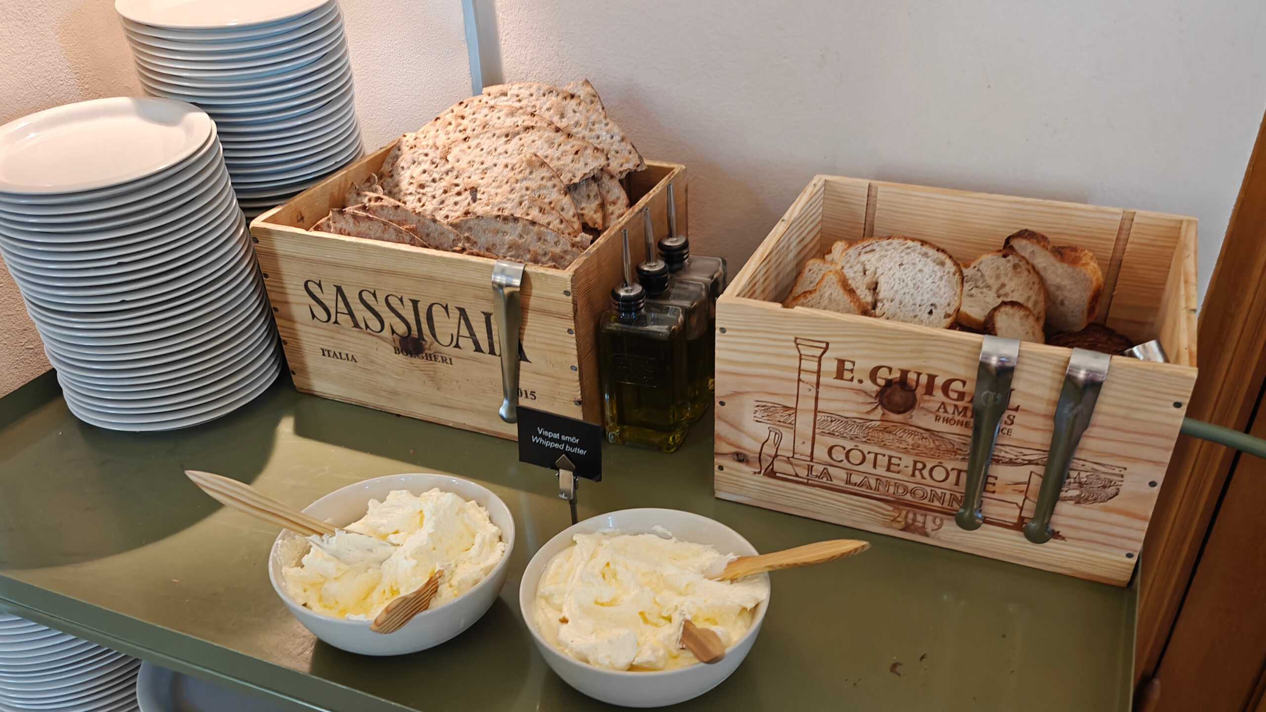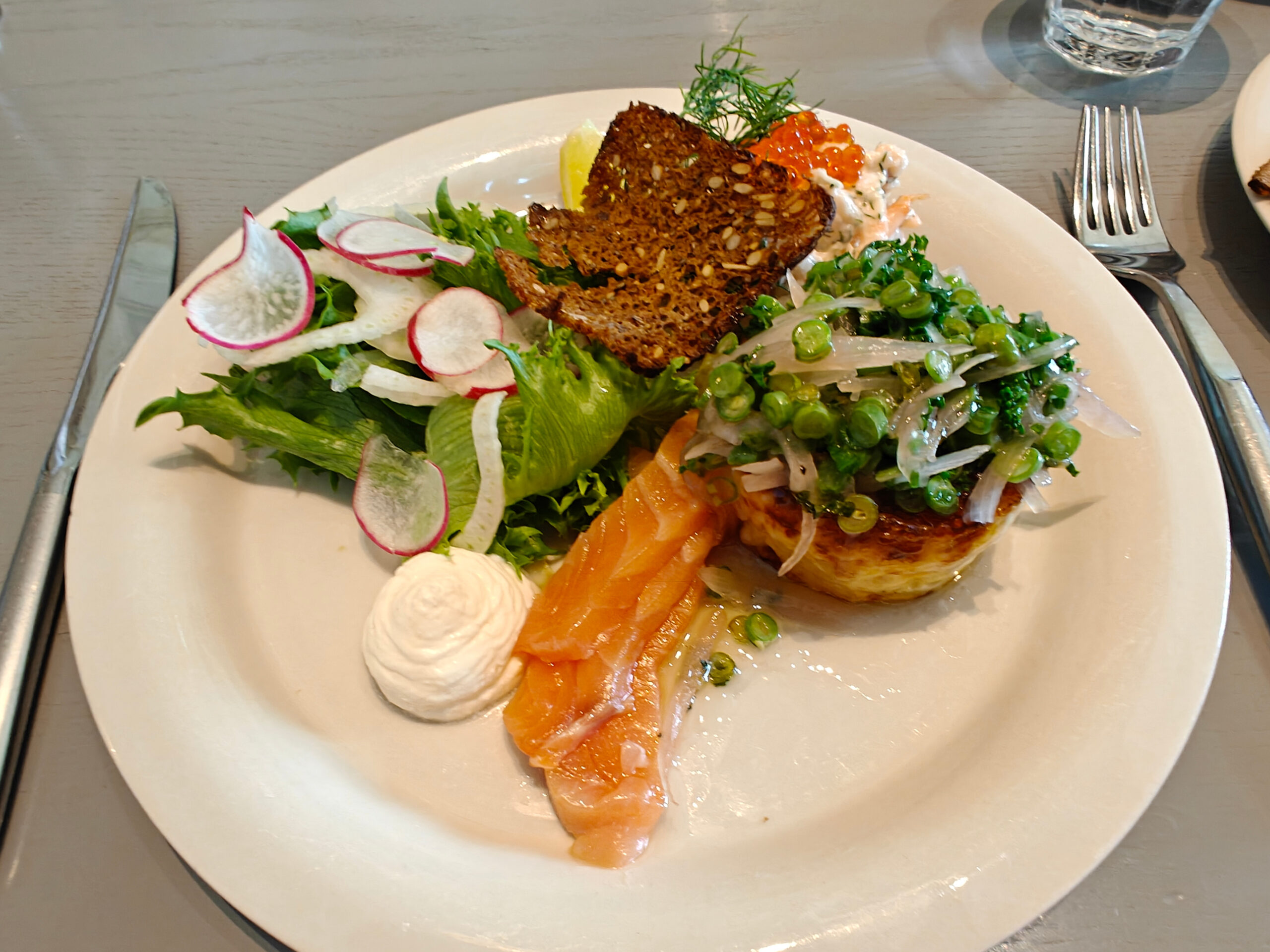 De lunch in het museumrestaurant was dan wel lekker, een typisch lunchbord hier in Zweden: gerookte zalm met mierikswortelcrème, garnalen in mayonaise, aardappel- en cheddar frittata met forelkuit en sjalottenvinaigrette. En bij zo’n lunch mag je onbeperkt brood of knäckebröd nemen. Dat staat naast de toog of ergens in de hoek, telkens met een bordje boter bij. En wat we ook erg kunnen appreciëren: overal is er ook gratis kraantjeswater te krijgen. Niet alleen in Stockholm trouwens, we hebben dat overal op onze reis gezien. Ook ’s avonds, als we ergens gingen heten, kwam er steevast “tap water” op tafel, soms hadden we zelfs de keuze om voor “sparkling tap water” te kiezen. In zo goed als alle gevallen gratis, en als het al eens aangerekend werd, ging het om 1 of 2 euro voor vaak 2 flessen. Dat zou ook in België moeten kunnen.
