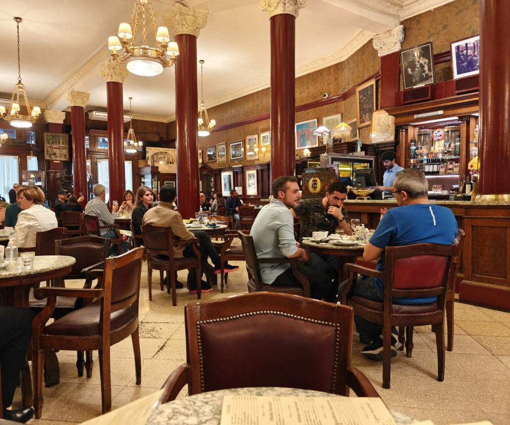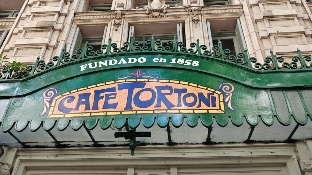 Daarna liepen we door naar de Avenida de Mayo, waar we in Café Tortoni een koffie wilden drinken. Aan de deur werden we tegengehouden: “It’s full, wait 5 minutes”. Na inderdaad een paar minuutjes mochten we binnen in één van de oudste cafés van Argentinië. De koffie was lekker, en welkom, na de slappe hotelkoffie bij het ontbijt. Toen we buitenkwamen bleek er intussen een lange rij wachtenden te staan – blijkbaar waren wij net op het juiste moment toegekomen. Zowat iedereen die het café bezoekt neemt zijn tijd om te genieten van de koffie en de sfeer, dus ik vermoed dat als je achteraan in de rij staat, je wel erg lang kan wachten.