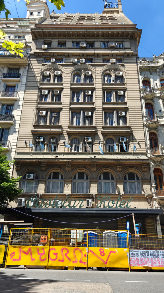 We liepen verder langs de Avenida de Mayo tot bij het Hotel Castelar. Het gebouw werd in 1928 geopend als Hotel Excelsior en werd ontworpen door de Italiaanse architect Mario Palanti – iemand die we later ook nog zouden tegenkomen. Meer recentelijk was het hotel de locatie van het dramatische aftreden van vice-president Carlos Álvarez op 6 oktober 2000, een mijlpaal die leidde tot het vertrek van president Fernando de la Rúa een jaar later. Fernando de la Rúa was president van Argentinië van 1999 tot 2001. Zijn presidentschap werd getekend door economische crisis en sociale onrust. De la Rúa kwam aan de macht met de belofte om de economische malaise en corruptie tegen te gaan, maar tijdens zijn bewind verergerde de financiële crisis dramatisch. De maatregelen van zijn regering, zoals bezuinigingen en het vasthouden aan de vaste wisselkoers met de dollar, verergerden de situatie. Eind 2001, te midden van hevige protesten en massale werkloosheid, trad hij uiteindelijk af en verliet hij het presidentieel paleis per helikopter. Zijn vertrek markeerde een dieptepunt in de Argentijnse economische geschiedenis.
