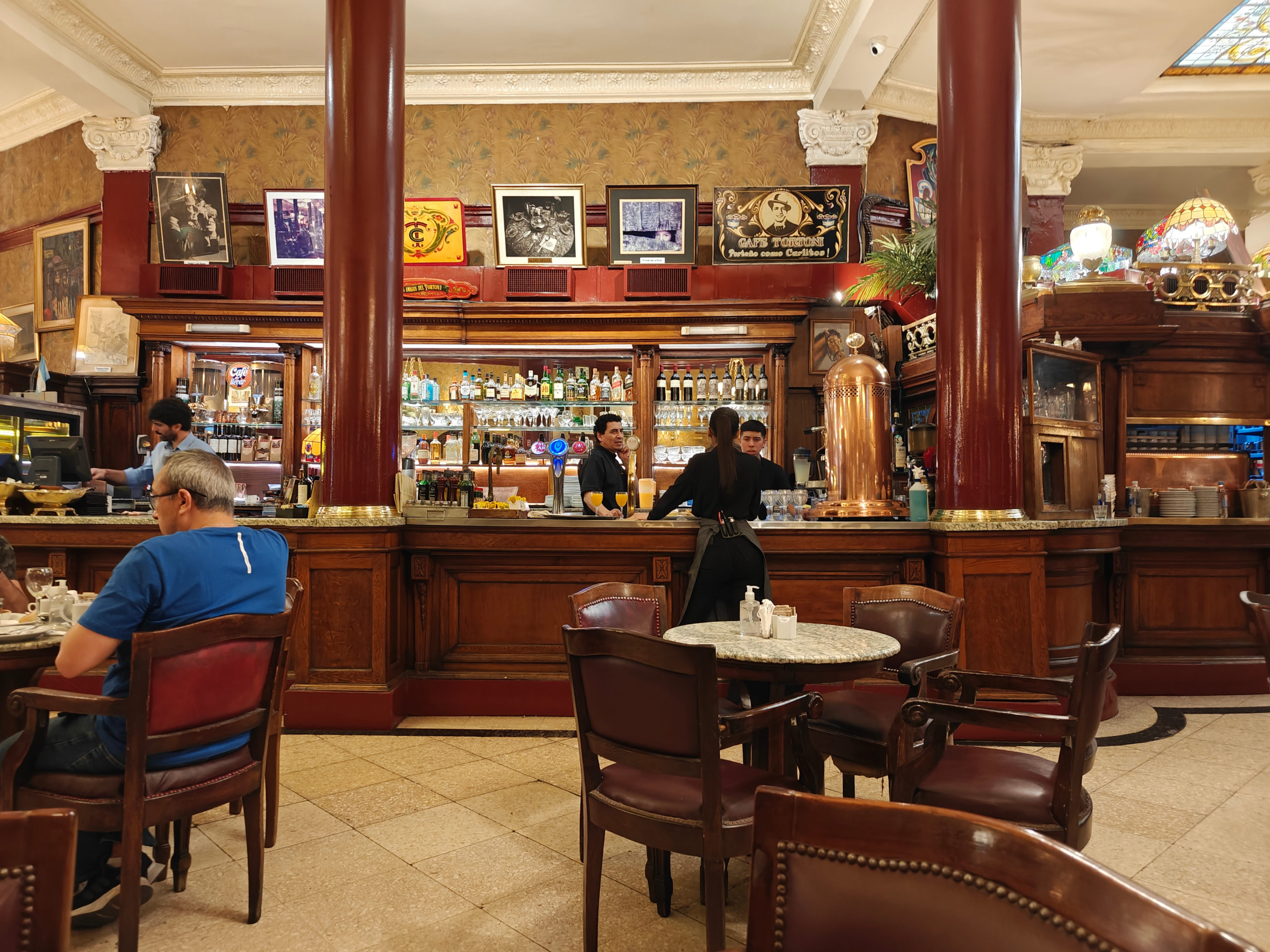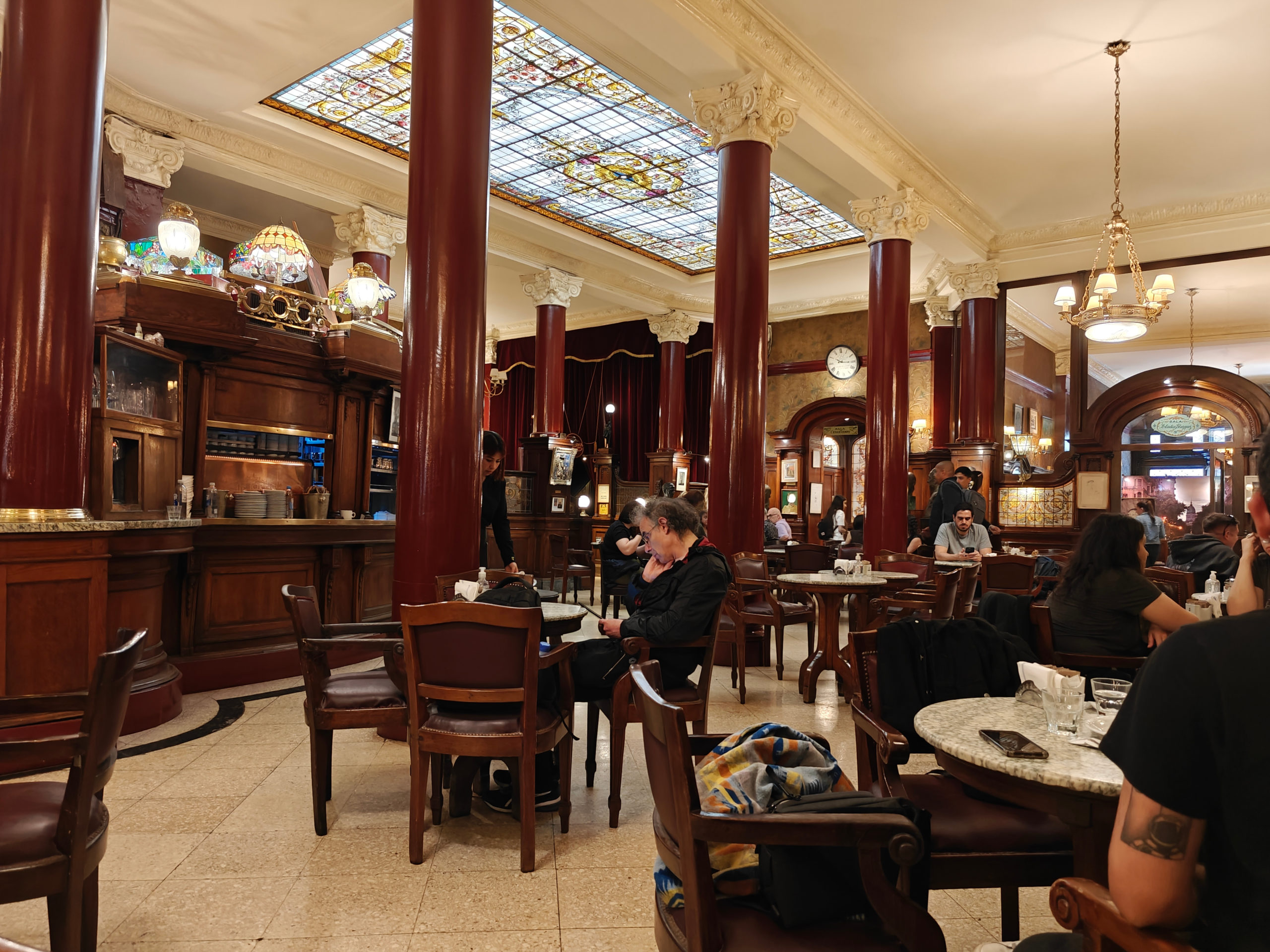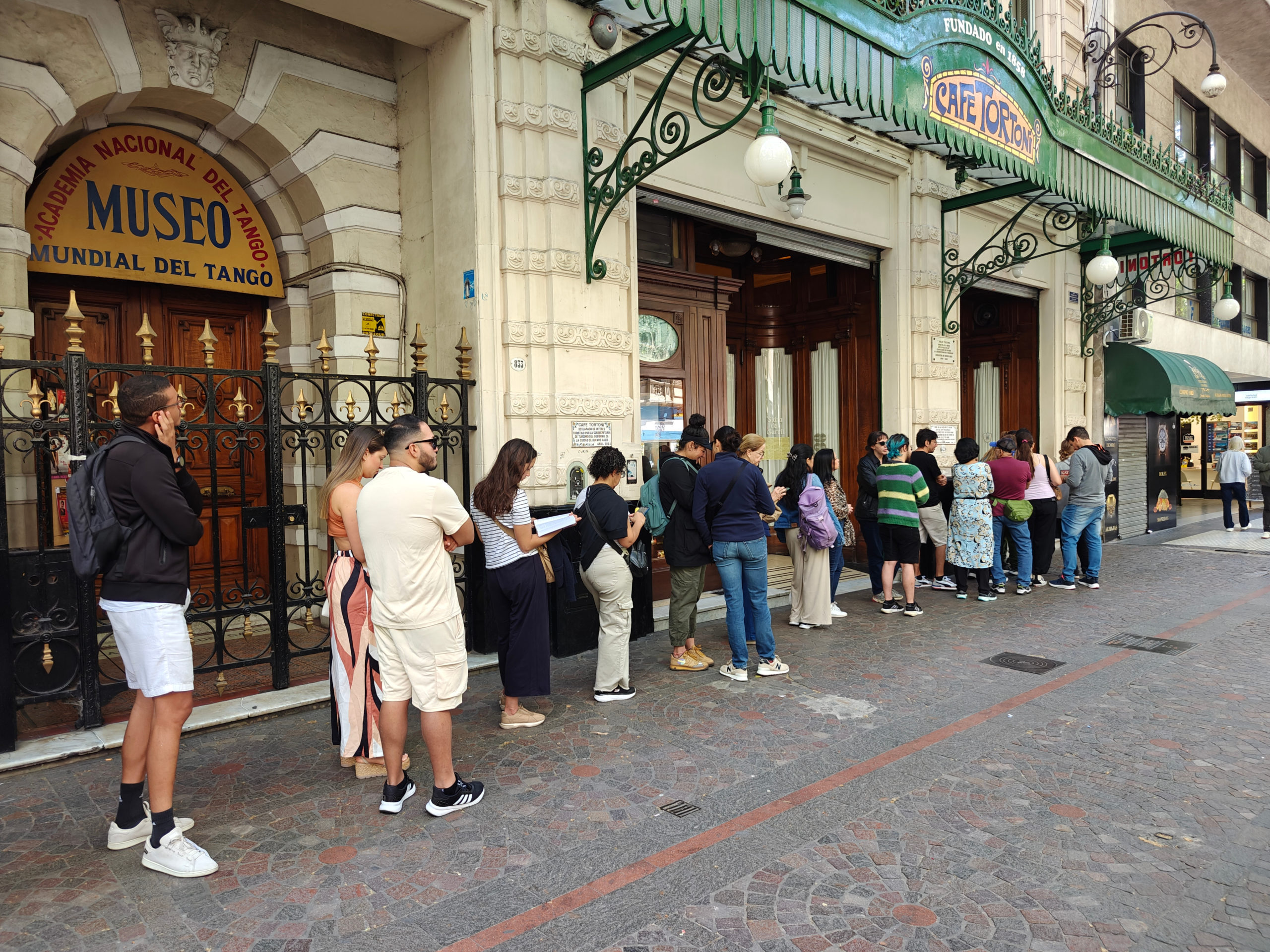Daarna liepen we door naar de Avenida de Mayo, waar we in Café Tortoni een koffie wilden drinken. Aan de deur werden we tegengehouden: “It’s full, wait 5 minutes”. Na inderdaad een paar minuutjes mochten we binnen in één van de oudste cafés van Argentinië. De koffie was lekker, en welkom, na de slappe hotelkoffie bij het ontbijt. Toen we buitenkwamen bleek er intussen een lange rij wachtenden te staan – blijkbaar waren wij net op het juiste moment toegekomen. Zowat iedereen die het café bezoekt neemt zijn tijd om te genieten van de koffie en de sfeer, dus ik vermoed dat als je achteraan in de rij staat, je wel erg lang kan wachten.