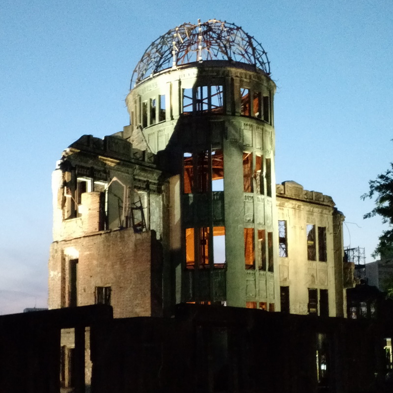We keerden terug met ferry, trein en het laatste stuk met de tram: het was vandaag prachtig weer en dus wou Philippe nog wat foto’s maken van wat er gisteren in de regen nogal somber uitzag op de plaats van de herdenking van de A-bom. Op de tram geldt de JR Pass niet: het systeem om te betalen is hetzelfde als wat we van onze vorige trip op bussen hadden gezien: bij het opstappen neem je een ticket uit de automaat naast de deur. Op dat ticket staat een nummer dat aangeeft waar je opgestapt bent. Met dat nummer kan je dan, bij het uitstappen, zien hoeveel je moet betalen. Je stapt vooraan af, bij de bestuurder, en gooit het ticket, samen het met bedrag in muntstukken, in de gleuf. Niet genoeg muntstukken bij? Naast die gleuf zit ook een wisselautomaat die briefjes van 1000 yen en muntstukken van 500 omwisselt in kleinere stukken.