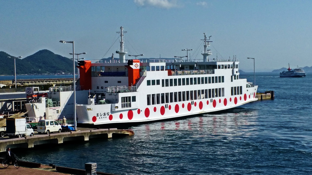 Het was vroeg opstaan vandaag, want we moesten de veerboot van 8u12 halen. Voor het ontbijt, dat inbegrepen was in de hotelovernachting, moesten we naar een piepklein restaurantje naast het hotel, dat pas om 7u30 openging. We kregen de keuze: “egg or fish”. In beide gevallen bleek het om een stukje gebakken ei of vis te gaan met verder een kop droge rijst, een kom hete miso soup, tofu en wat Japanse groenten. Helemaal niet lekker, vonden we – gekookt eten ’s morgens is niets voor ons – maar tijd voor een alternatief hadden we niet: ook op het vertrek van boten kan je hier in Japan je klok gelijk zetten, stiptheid is hier gewoon de norm, dus met een half lege maag dan maar de boot op.