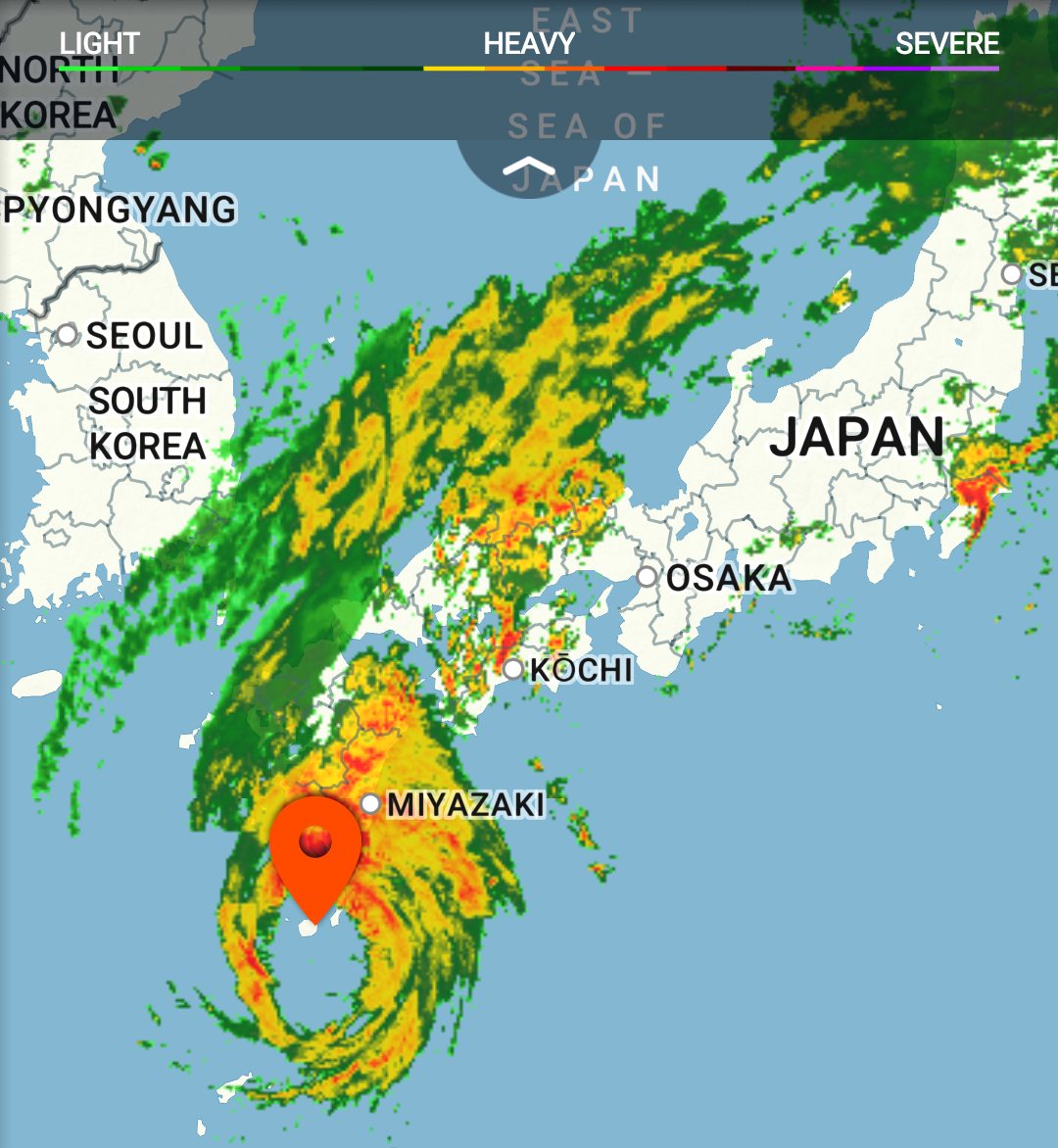 Vannacht liet Trami dan eindelijk van zich horen. Letterlijk, met heel veel wind en regen. Volgens het Japans meteorologisch instituut is al 25 jaar geleden dat er in Anbo, waar we verblijven, nog zoveel regen is gevallen in 1 nacht. Maar toen we opstonden was het windstil en scheen de zon. De weerapp op onze telefoon maakte snel duidelijk dat we ons in het oog van de tyfoon bevonden. Schade aan het huis was er niet, we zagen buiten wel afgerukte takken en omgewaaide borden.