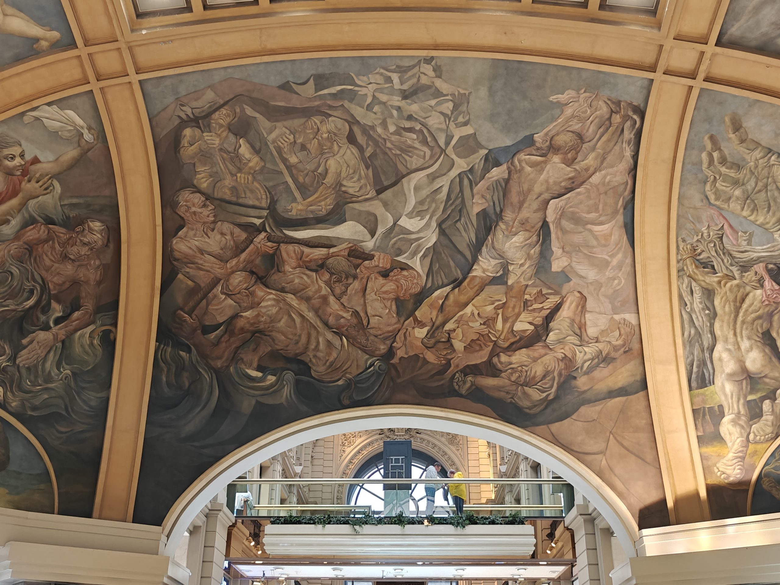 Het bleef regenen, en dus eindigden we onze eerste uitstap in de hoofdstad in Galerías Pacífico, dat rond 1890 werd gebouwd als winkelgalerij naar Italiaans voorbeeld, later dienst deed als kantoor van de spoorwegen, en in 1992 is herrezen als chique winkelcentrum. We waren er niet zozeer de winkels, maar wel voor de 450 m2 aan fresco’s die het centrale koepelgewelf sieren en die in 1945 werden vervaardigd als een samenwerkingsproject door de Argentijnse nieuwe realisten. Al vielen die in het echt toch een beetje tegen.