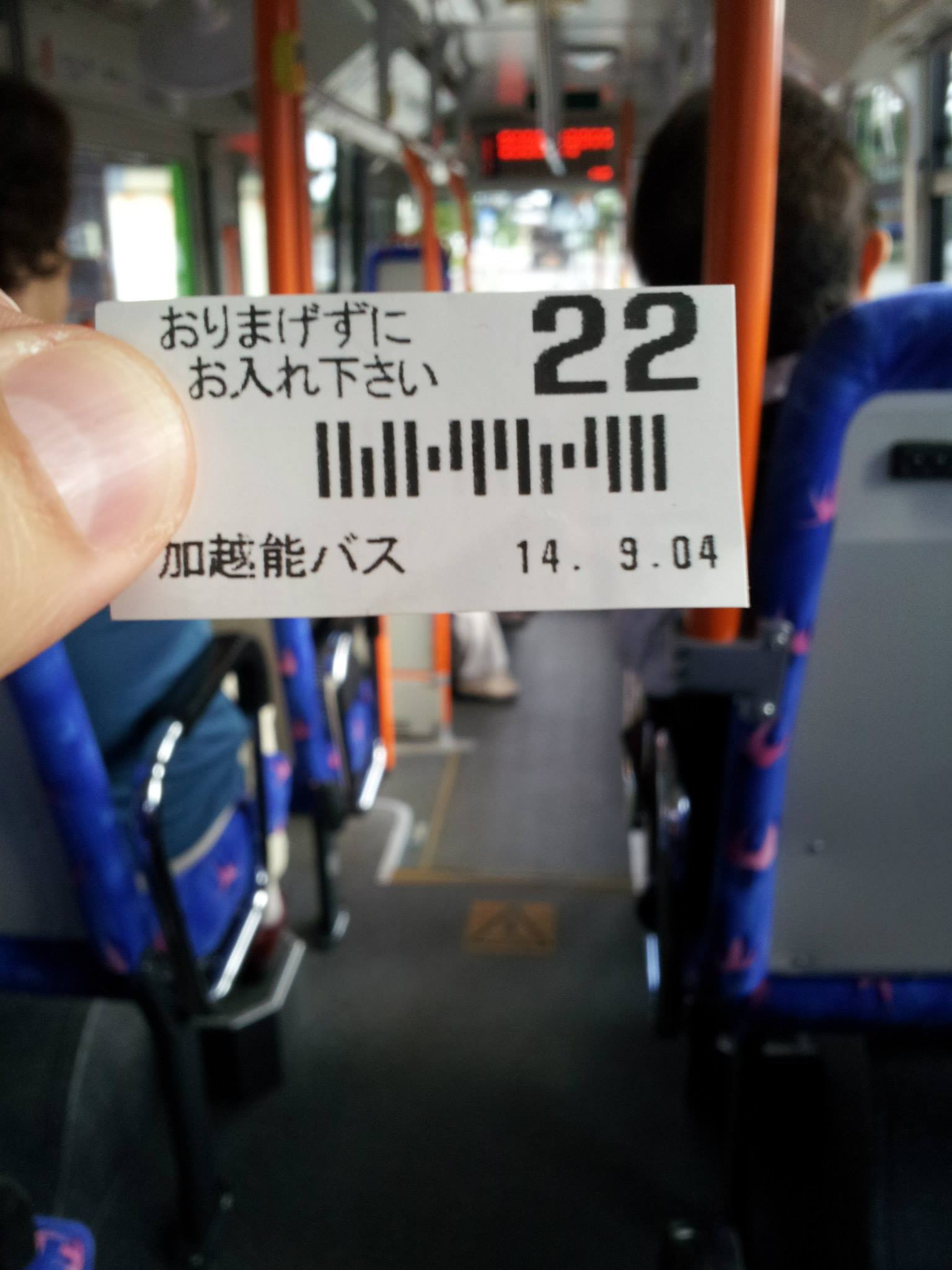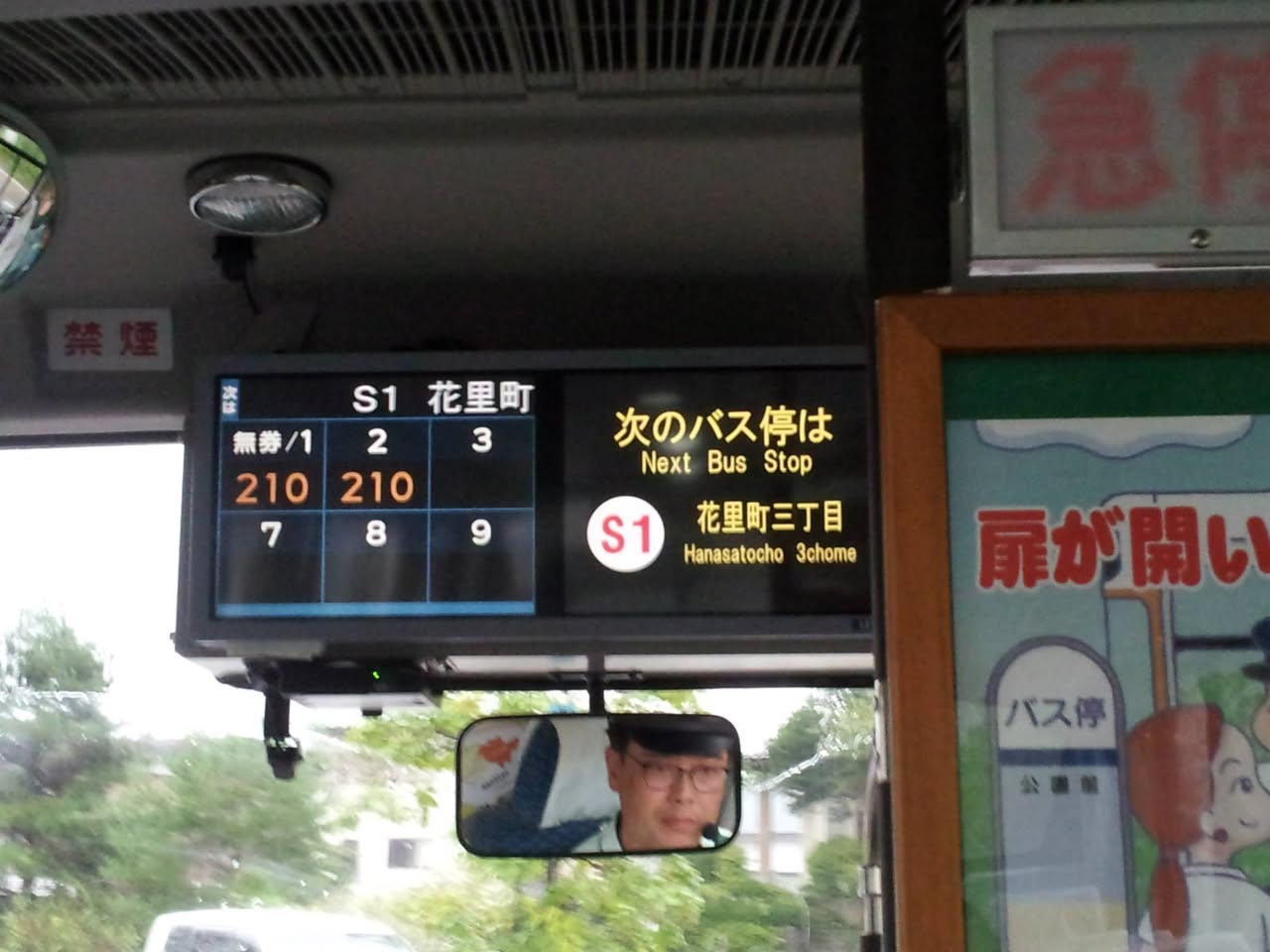 bij het binnenkomen in de bus neem je een ticket, waarop een nummer staat. bij het afstappen kijk je dan op het scherm hoeveel yen er bij dat nummer staat, dat is het bedrag dat je moet betalenin de stadsbus van Takayama zie je wanneer de chauffeur een richtingsaanwijzer gebruikt en wanneer hij remt