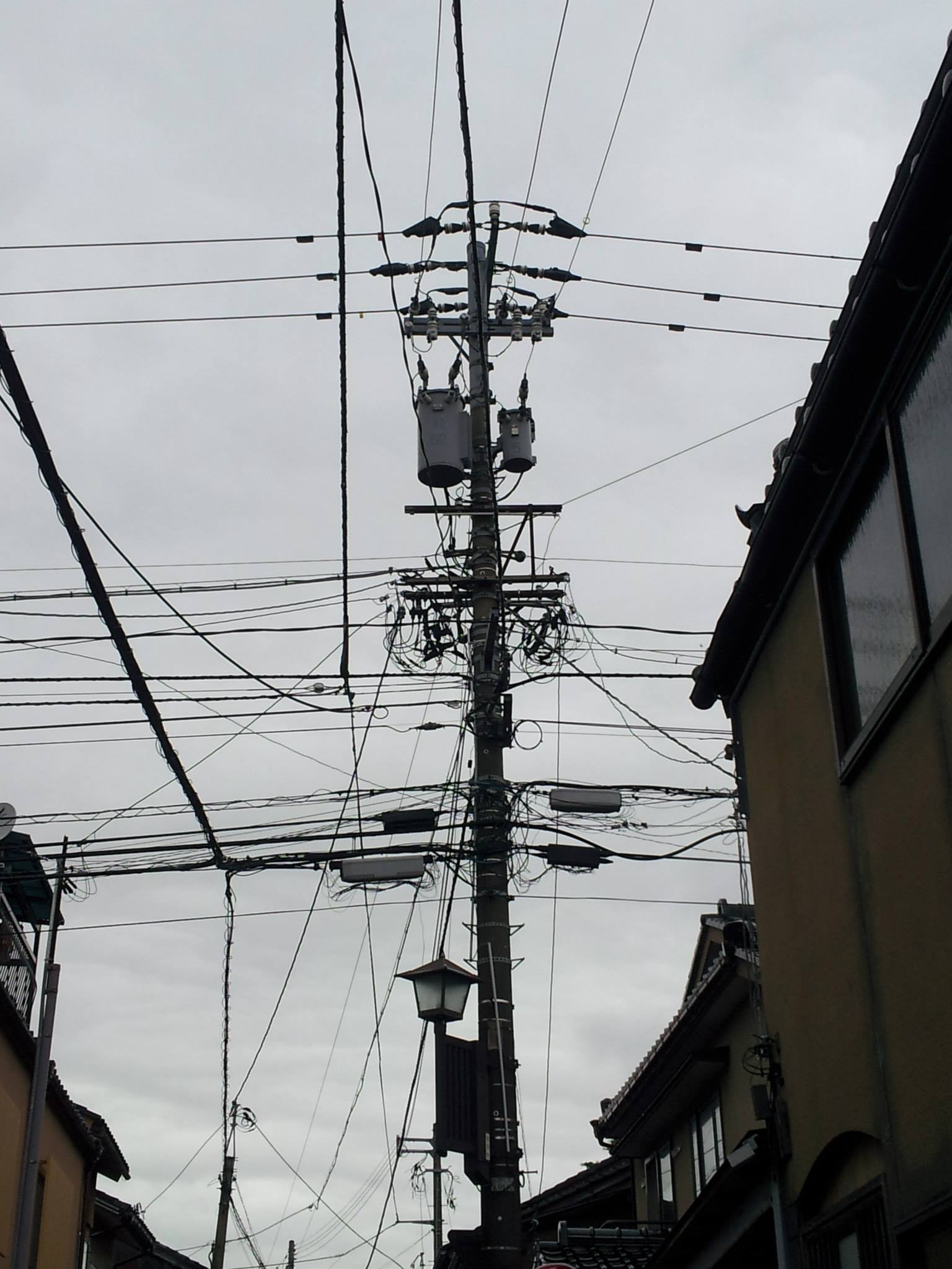 het oude en nieuwe Japan in 1 foto: de Japanse “DHL” en een geishaik blijf me verbazen over de electriciteitsdradenwirwar