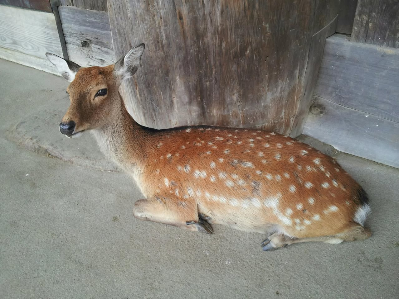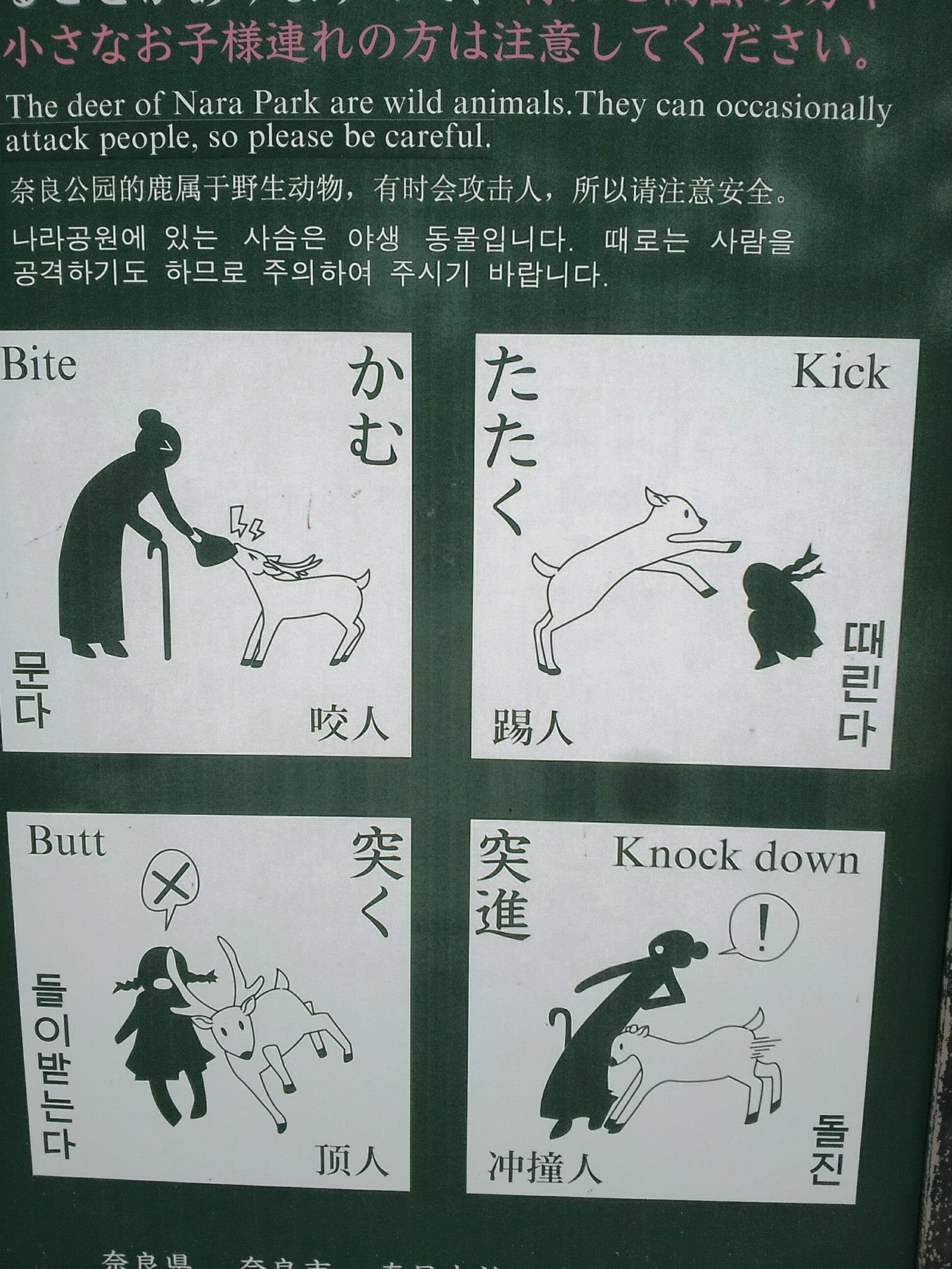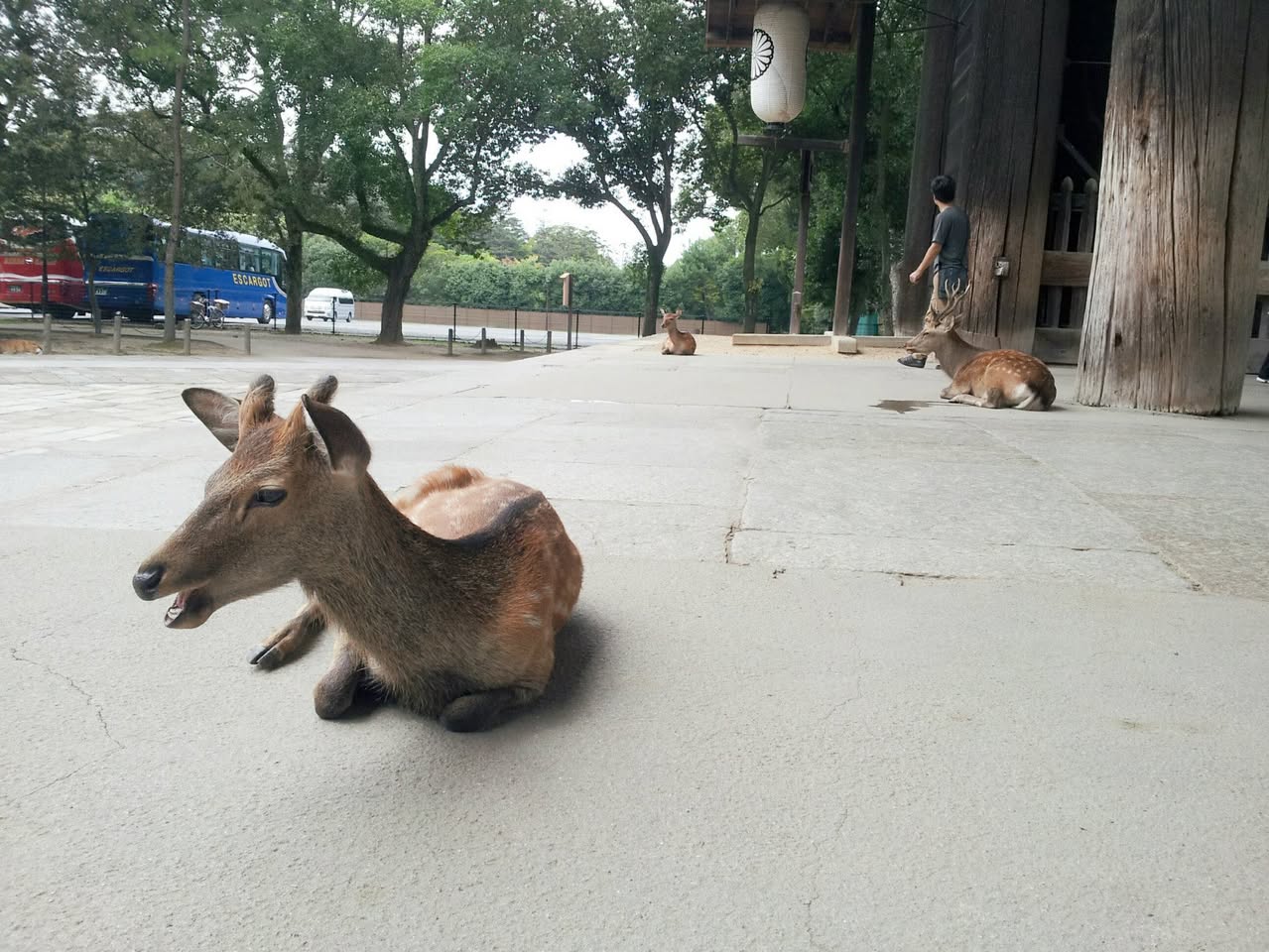 ze liggen hier overal…… hebben geen schrik van mensen …… want het zijn ‘heilige dieren’ in Nara …… maar ze zijn minder onschuldig dan ze eruit zien … ook ik had het vlaggen (of beter, de plastic zak met een fles water die ik vasthad) – rotbeesten!nee, honden NIET aan de leiband hier 🙂