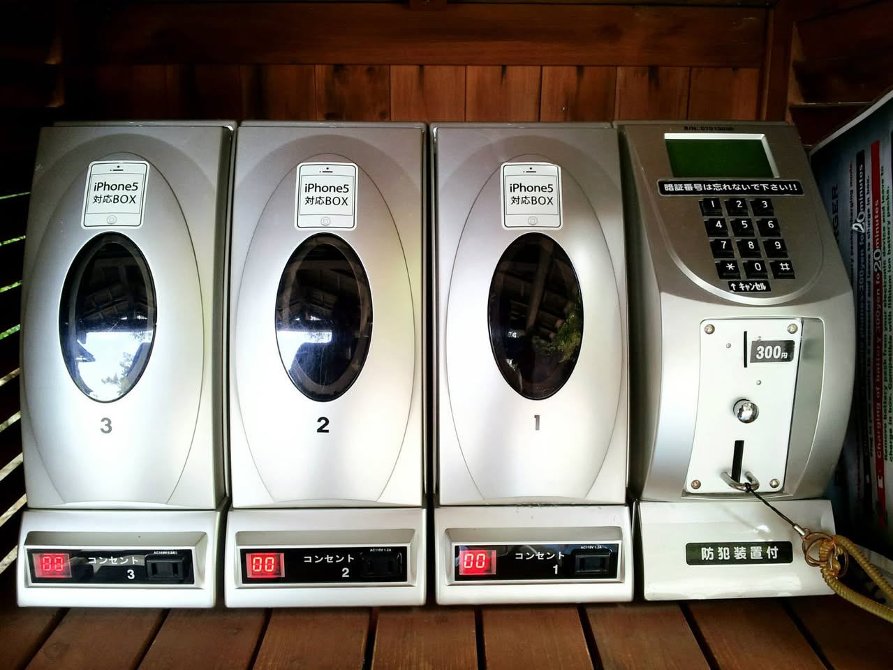 hier kan je voor 300 yen je iPhone of iPod in zo’n box steken, en die wordt dan opgeladen. Je beveiligt de box met een pincode.bij werken wordt extra veel aandacht geschonken aan de omgeving – zou beter in België ook gebeurengrappigook voor het toilet, netjes in de rij gaan staan