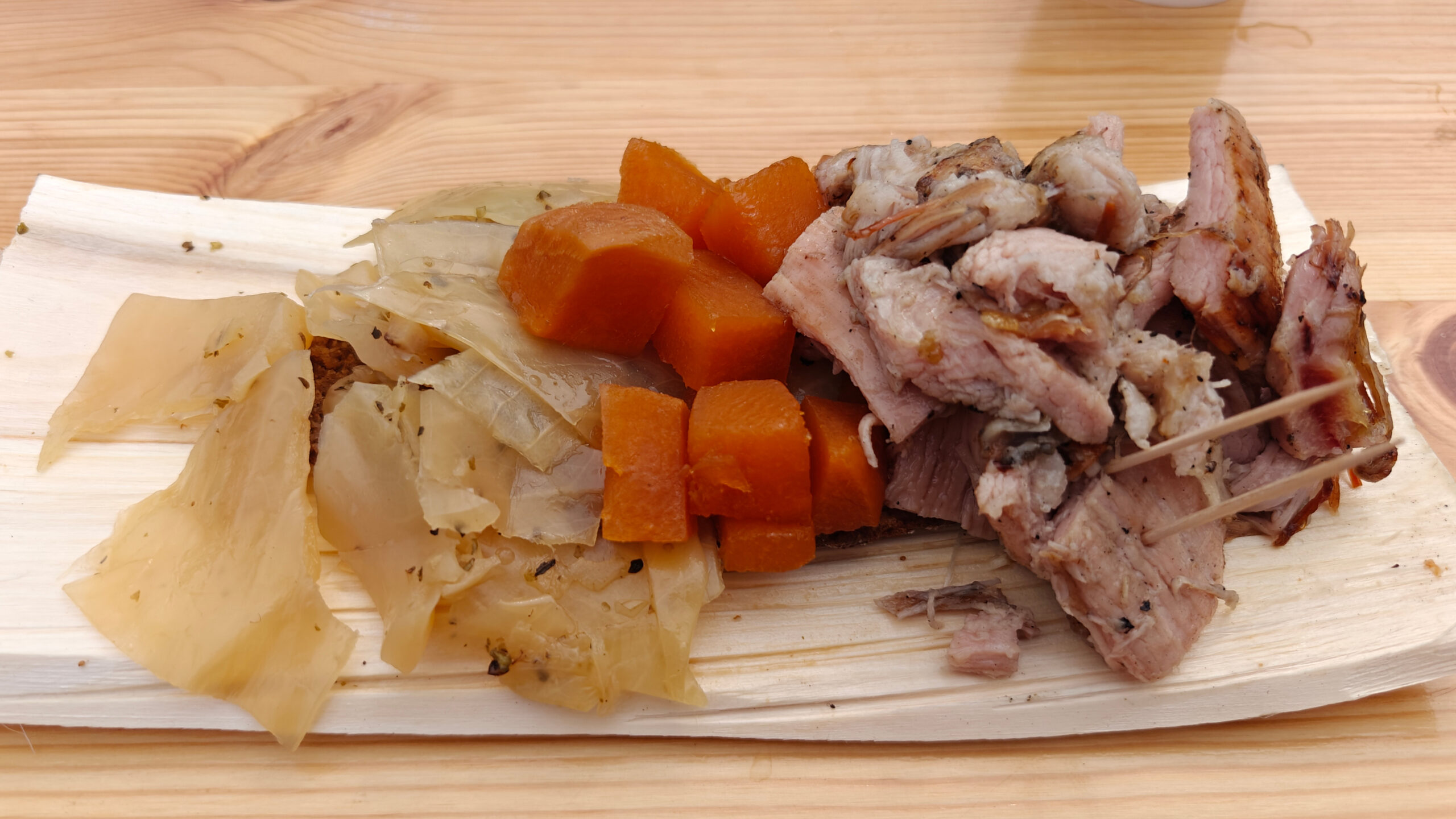 Op het plein naast het kasteel was een soort middeleeuws spektakel aan de gang, met ridders op paarden die aan het ringrijden waren. Bij ringrijden probeert een ruiter in volle galop een kleine ring, die aan een koord hangt, op een lans of spies te rijgen. Daarrond stonden kraampjes met eten. We kozen voor een “middeleeuws” bord met vlees van varken aan het spit.