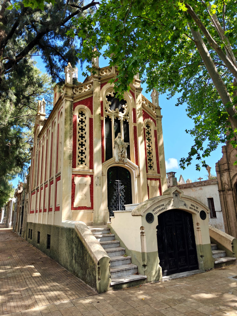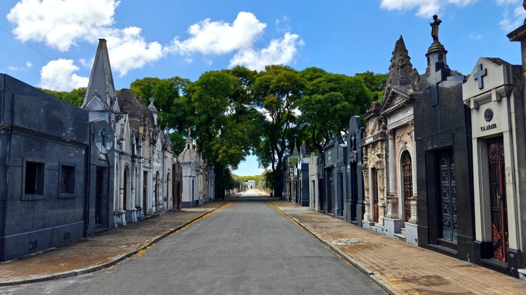 Twee weken geleden bezochten we al het Cementerio de la Recoleta. Vandaag trokken we naar Cementerio Chacarita. Dat is een begraafplaats die veel minder mensen kennen – en waar je ook geen toegangsgeld moet betalen. Het gevolg is wel dat het er hier en daar wat verloederd bijligt. Maar het blijft indrukwekkend: al die graven die vaak kleine huisjes lijken. Carlos Gardel, de befaamde tangozanger wiens museum we later zouden bezoeken, ligt hier begraven. Ook het brutalisme van de toegangen tot de urne-galerijen valt op.
