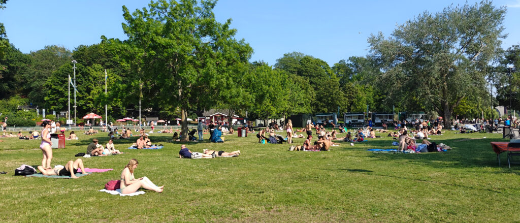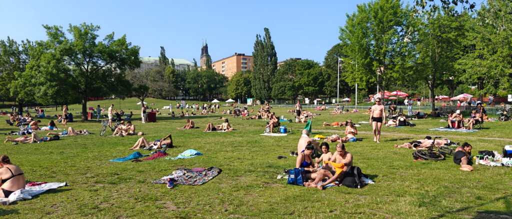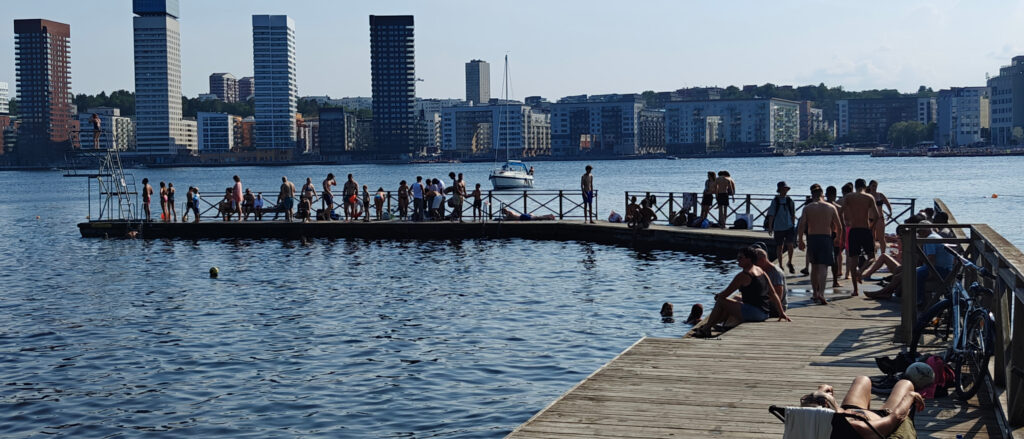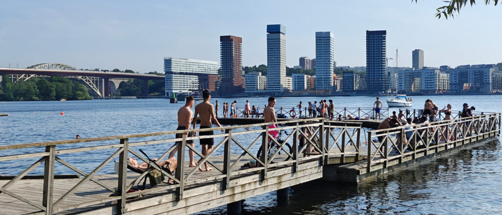 Na nog een espresso in Svedjan Bageri, een fijne koffiebar vlakbij ons hotel, namen we de bus naar Tanto strandbad, een strand op het schiereiland waar we verblijven. Al is “strand” een eufemisme: er is een zandstrook van pakweg 5 meter breed en 40 meter lang. 200m² strand dus. En vermits het de eerste echte zomerdag in Stockholm was, was elke vierkante centimeter ingenomen. Ook op het ponton ernaast was het erg druk. Maar gelukkig ligt er ook een vrij groot park naast waar we een uurtje of zo van de zon hebben kunnen genieten.