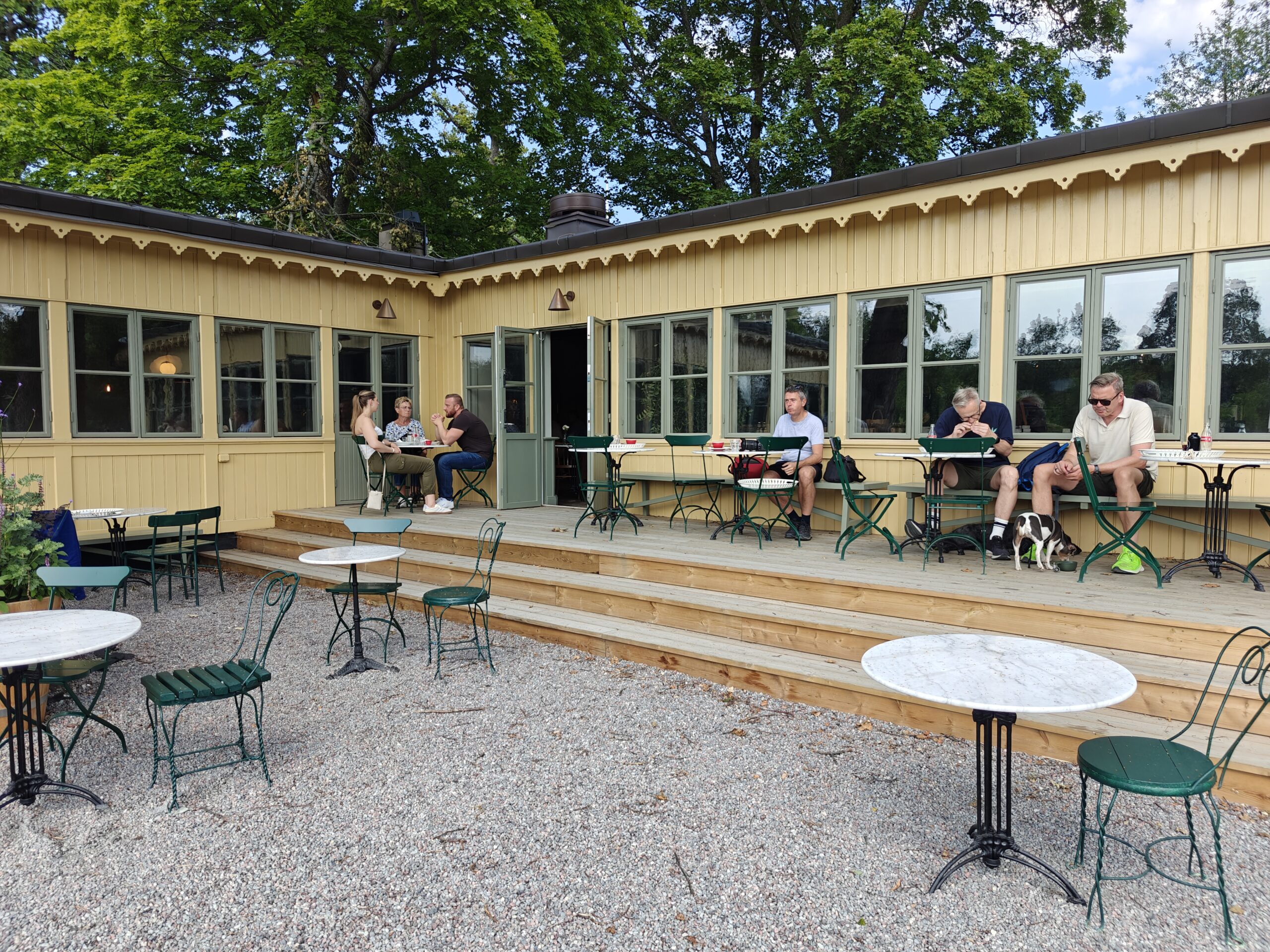 Na het bezoek begonnen we aan een lange wandeling over Södra Djurgården. Het is een schiereiland met heel wat groen, midden in Stockholm. Ik had een espresso-pauze voorzien in Rosendals Trädgård, een café/restaurant bij een tuincenter waar ze uitsluitend met organische en biologische ingrediënten werken, maar er was enkel een grote kan filterkoffie. Toen we aan een serveerster vroegen waarom dat was, zei ze “we Swedes are not picky when it comes to coffee.” Wel, wij zijn dat wel, en dus lieten we de Trädgård links liggen en gingen op zoek naar een beter adres. Dat vonden we bij Djurgårdsbrunns Wärdshus, een etablissement aan de rand van het water dat al bestaat sinds 1742, al is er nu nog maar een klein deel over van de oorspronkelijke herberg.